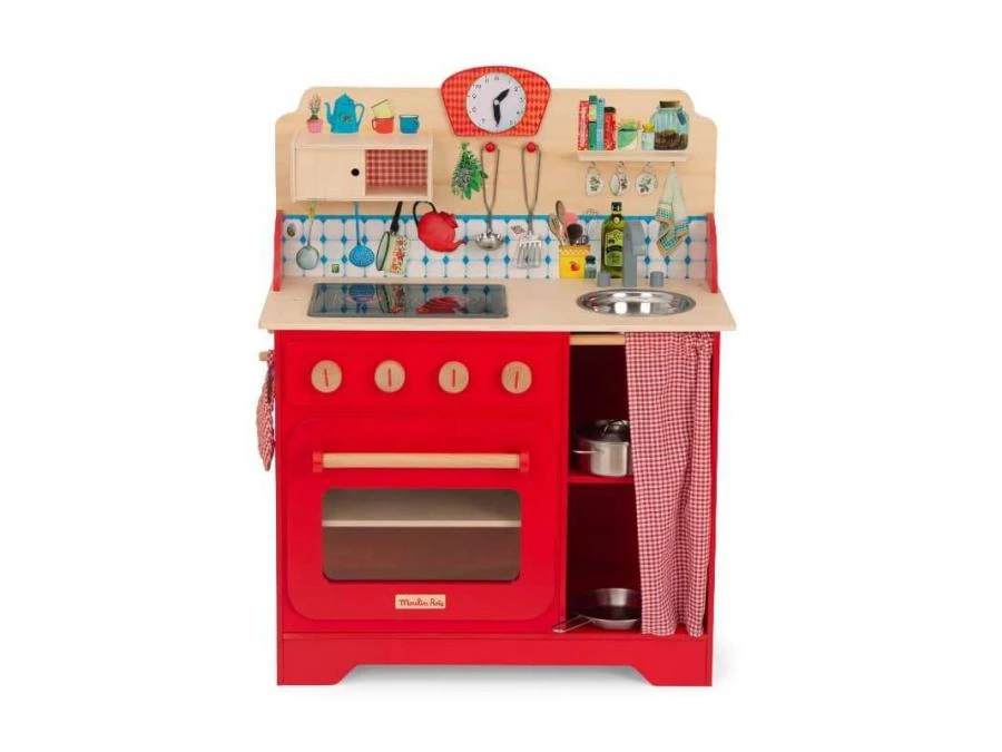 Chouette, une journée aux fourneaux avec la Grande Famille ! Cette cuisinière illustrée en bois comprend tous les accessoires pour préparer de bons petits plats : des ustensiles en métal, une manique vichy, et une plaque de cuisson sonore et lumineuse.