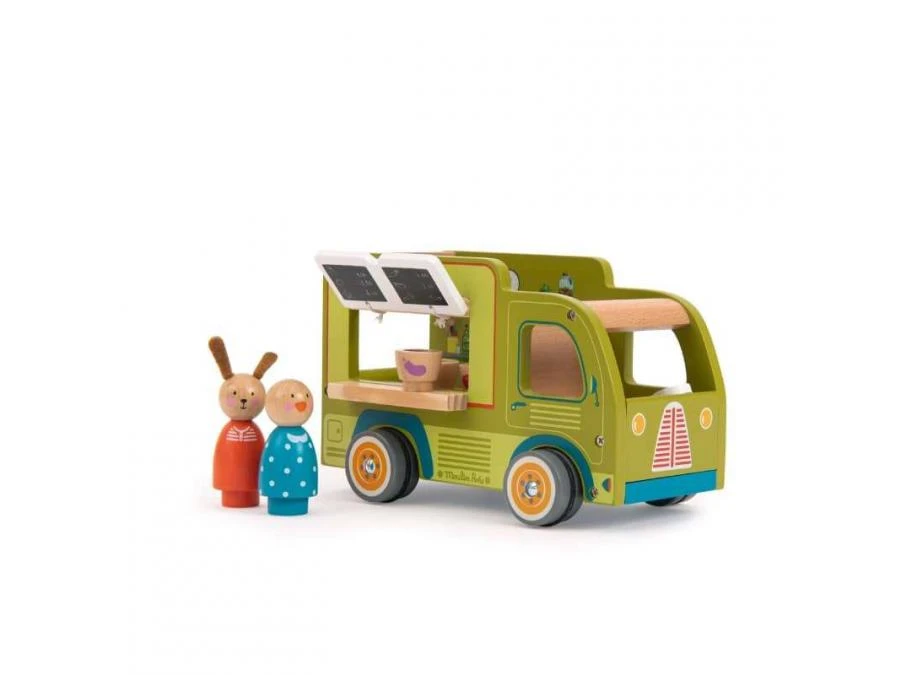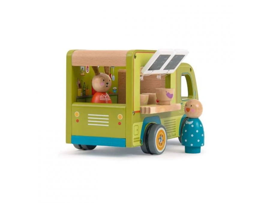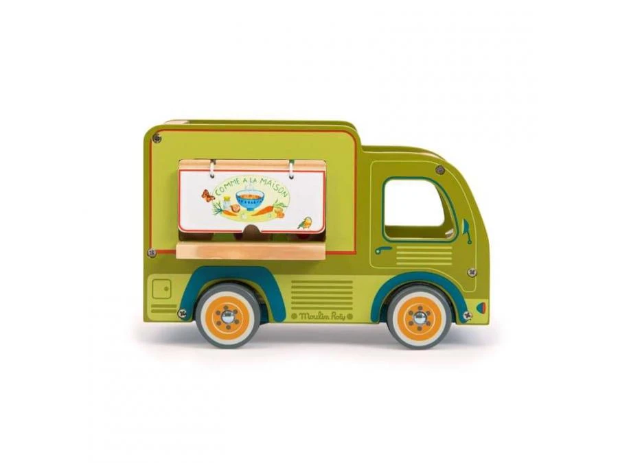 Ding-dong ! Le camion-restaurant de la Grande Famille est prêt à vous servir ses bons petits plats : soupes et tartines comme à la maison ! Tout en bois et entièrement illustré, il roule et comprend une fenêtre ouvrante pour accueillir les clients.