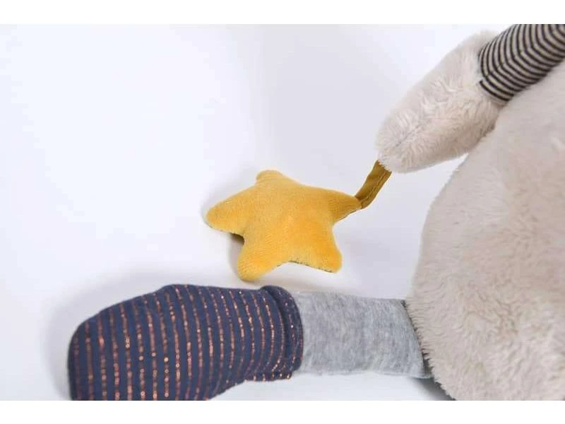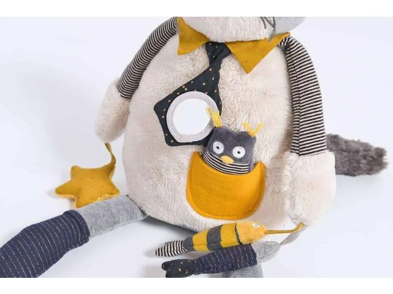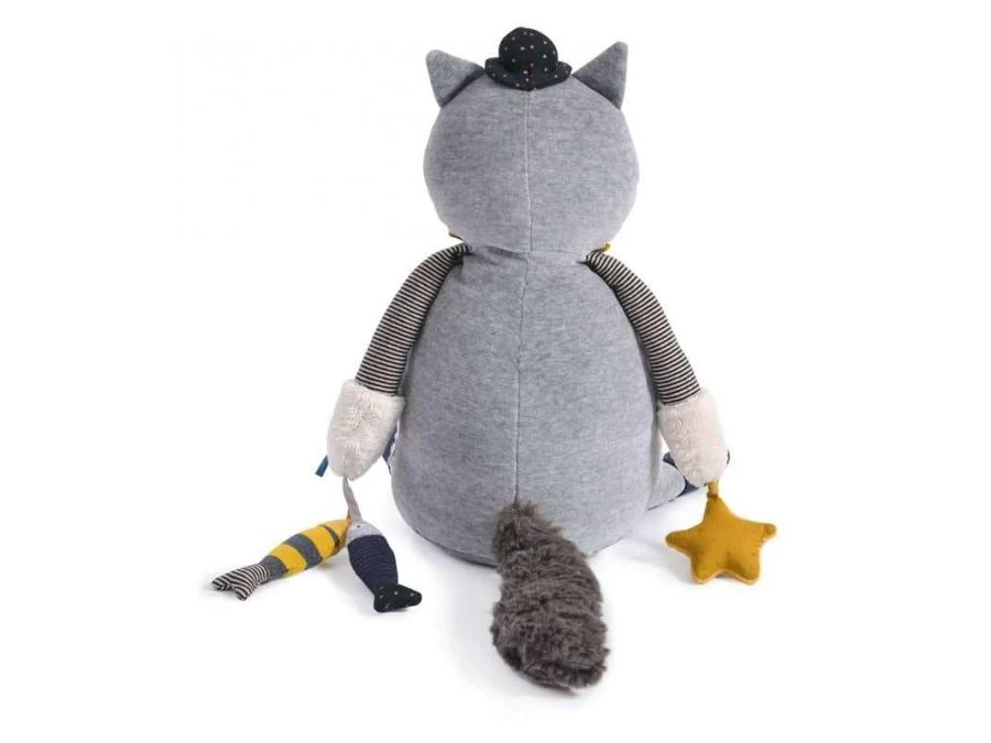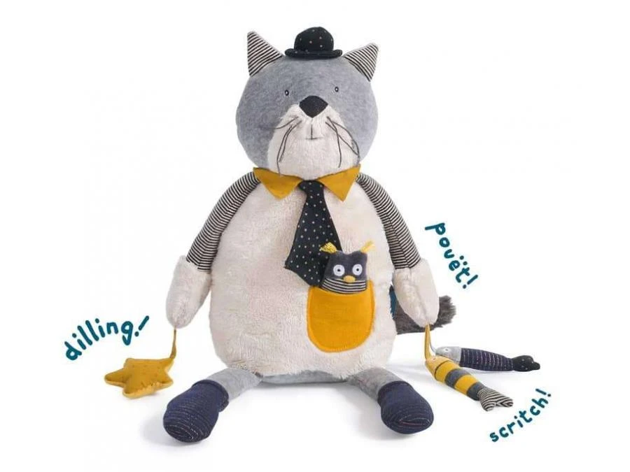Un beau chat aux multiples talents : pouet-pouet, hochet, plastique qui fait du bruit, miroir… et ses amis les poissons, son petit hibou et les étoiles.