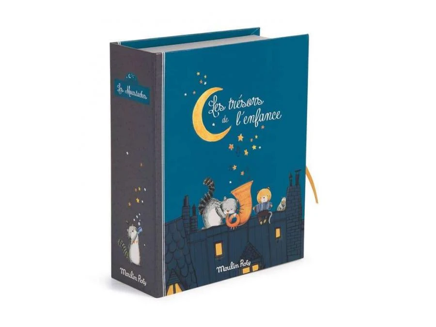 Coffret Ă trĂ©sors pour ranger dans chacun des tiroirs toutes les douceurs de l’enfance. Reprend tous les personnages de la gamme dans leur univers de la nuit. Fermeture avec liens et petite cartonnette en forme d’enveloppe pour y Ă©crire son nom.