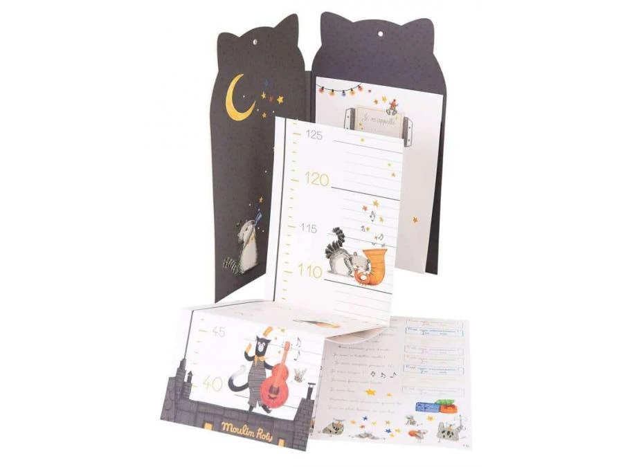 Toise en carton avec stickers dĂ©co reprenant les couleurs et illustrations de la gamme, prĂ©sentĂ©e sous la forme d’un carnet et qui, dĂ©pliĂ©e, devient un ravissant accessoire dĂ©co pour y noter la taille de bĂ©bĂ© mais aussi toutes les anecdotes le concernant.