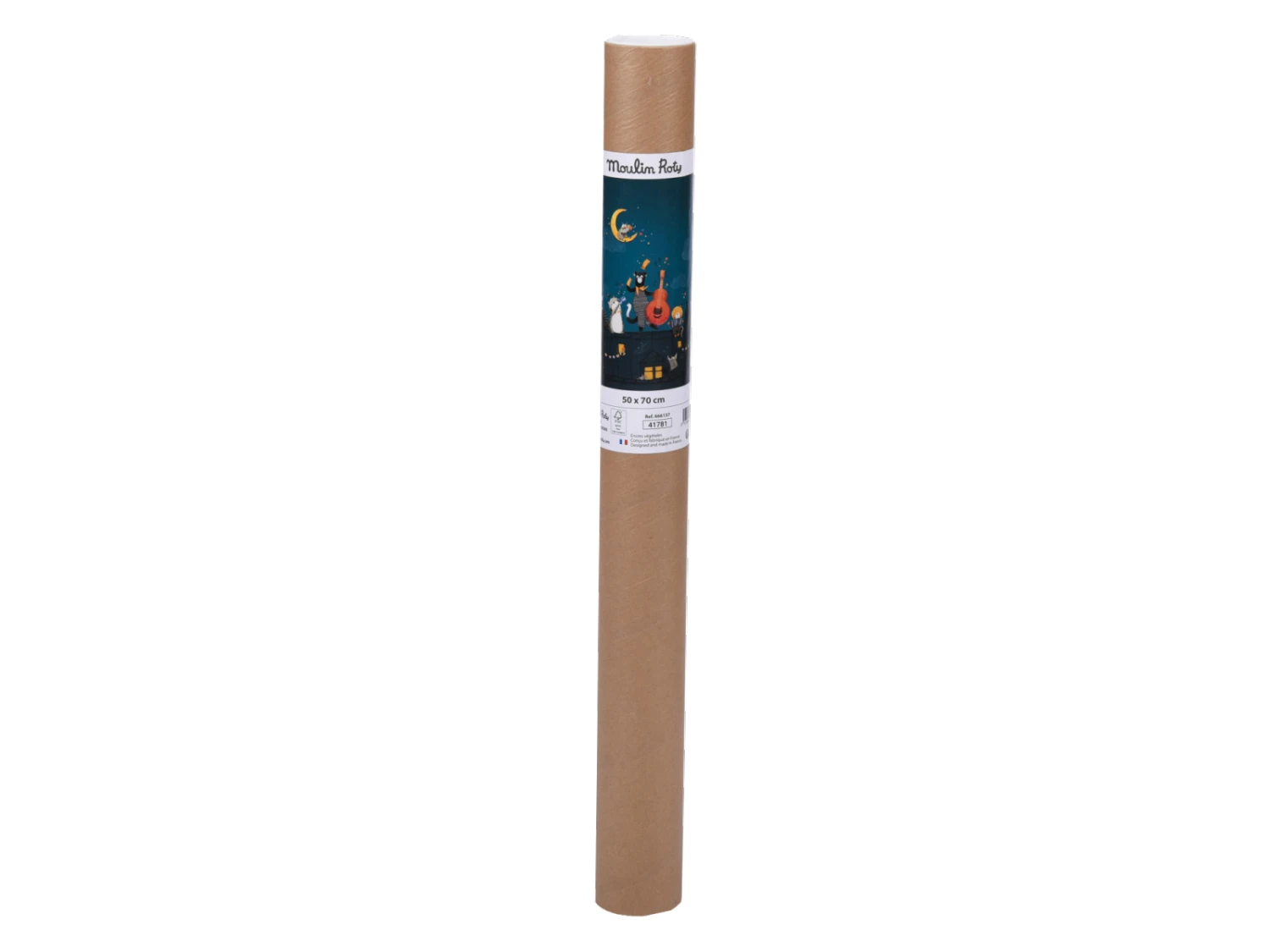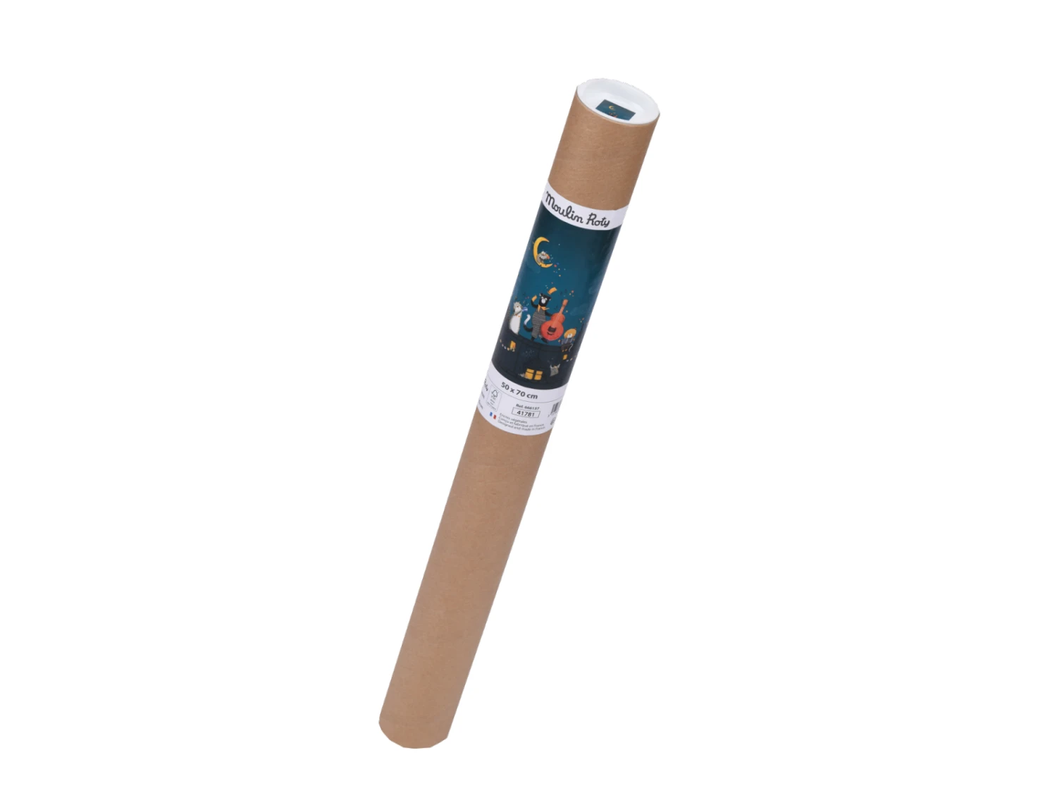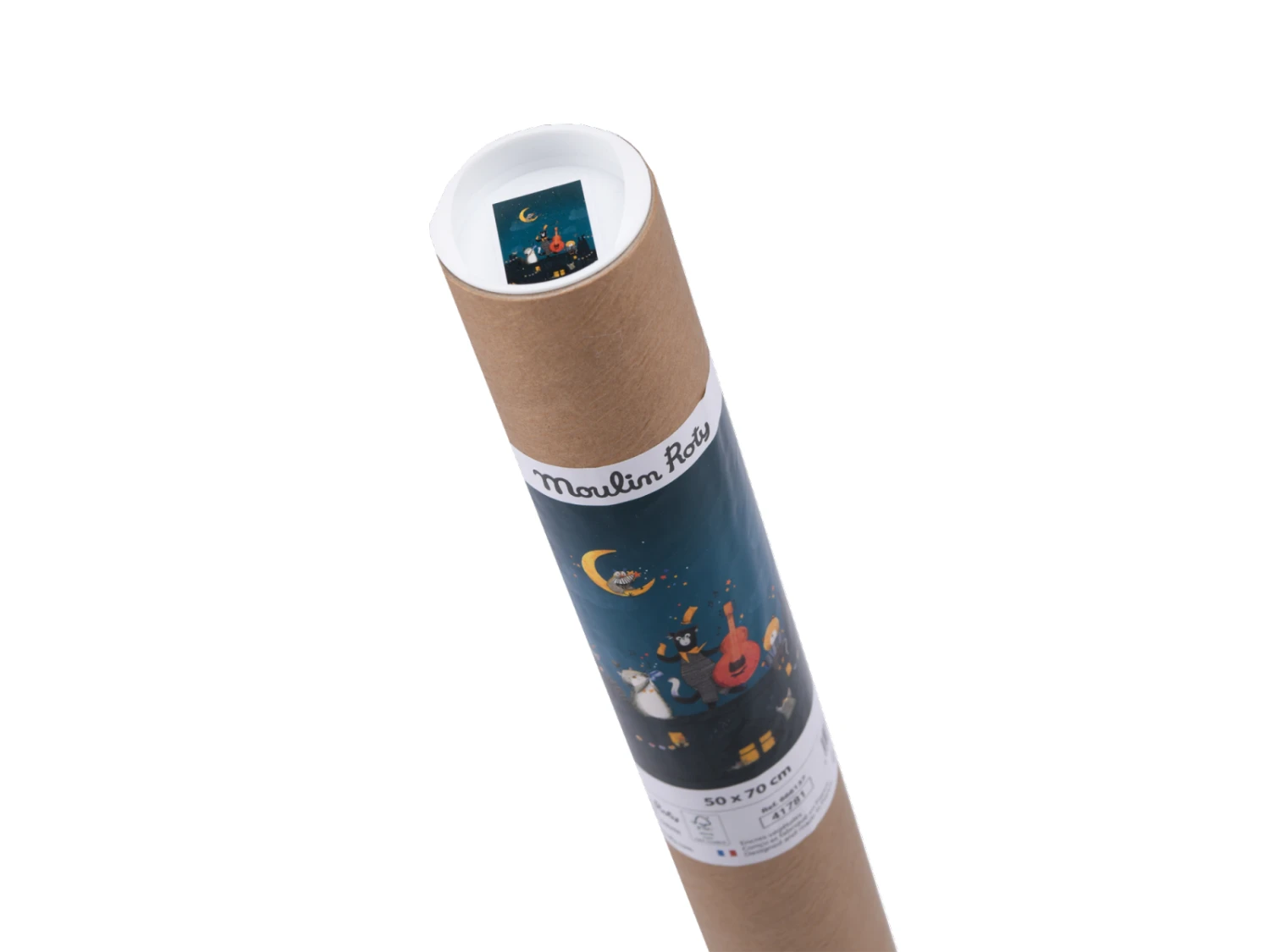 Affiche 50x70cm de la collection Les Moustaches. Sur les toits de la ville endormie avec d’adorables chats dandys. Imprimé en France à base d’encres végétales sur du papier certifié FSC.