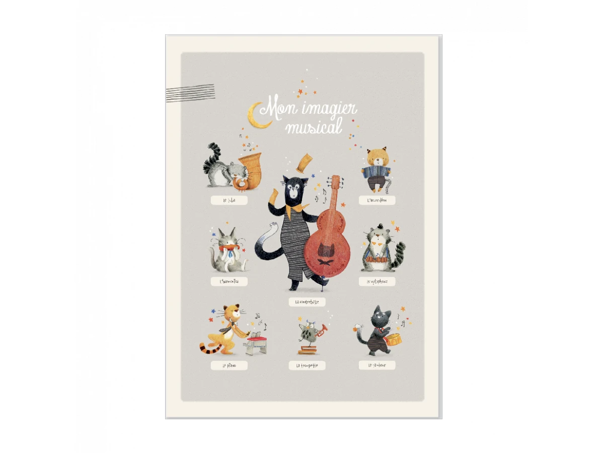 Affiche 50x70cm de la collection Les Moustaches. Le piano, la trompette, l’harmonica, le tuba… l’imagier musical des Moustaches. ImprimĂ© en France Ă base d’encres vĂ©gĂ©tales sur du papier certifiĂ© FSC.