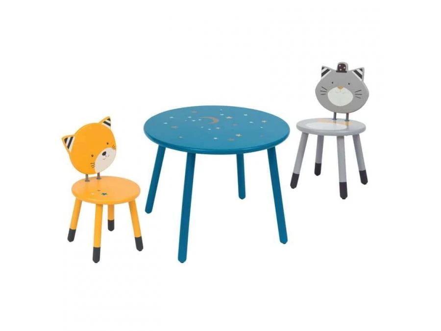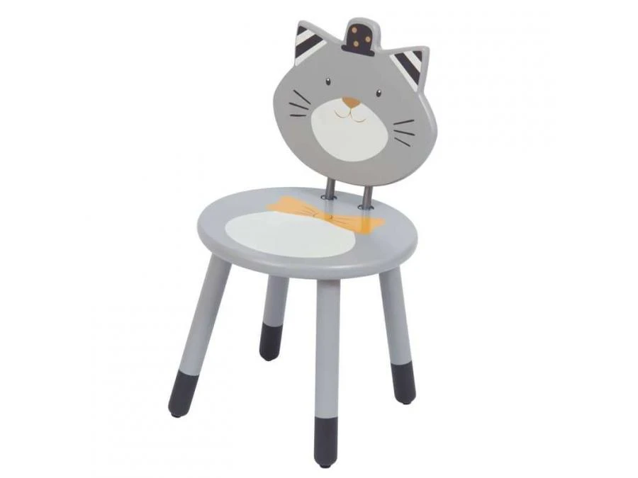 Chaise gris clair en bois avec dossier Fernand le chat toujours coiffĂ© de son chapeau melon ! IdĂ©ale pour accompagner la table Les Moustaches, elle servira aussi bien dans la chambre qu’au salon !
