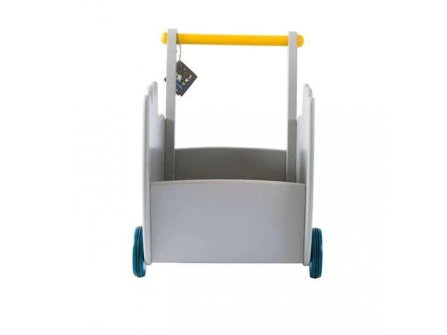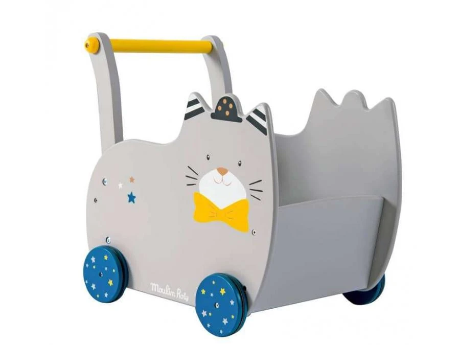 Pour accompagner l’enfant dans l’apprentissage de la marche et transporter tous ses jouets : chariot en bois peint, aux formes rondes, avec la tête rigolote de Fernand le chat et son chapeau de soirée !