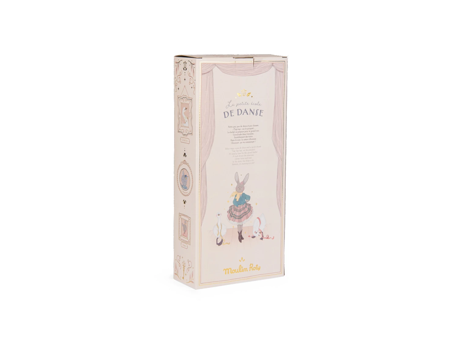 Poupée lapin en chambray au doux visage brodé, Victorine, d’une grande élégance est vêtue de sa robe à carreaux et de son tulle pailleté. Facile à attraper par les petites mains, elle deviendra le compagnon de jeu privilégiédes petits danseurs en herbe.