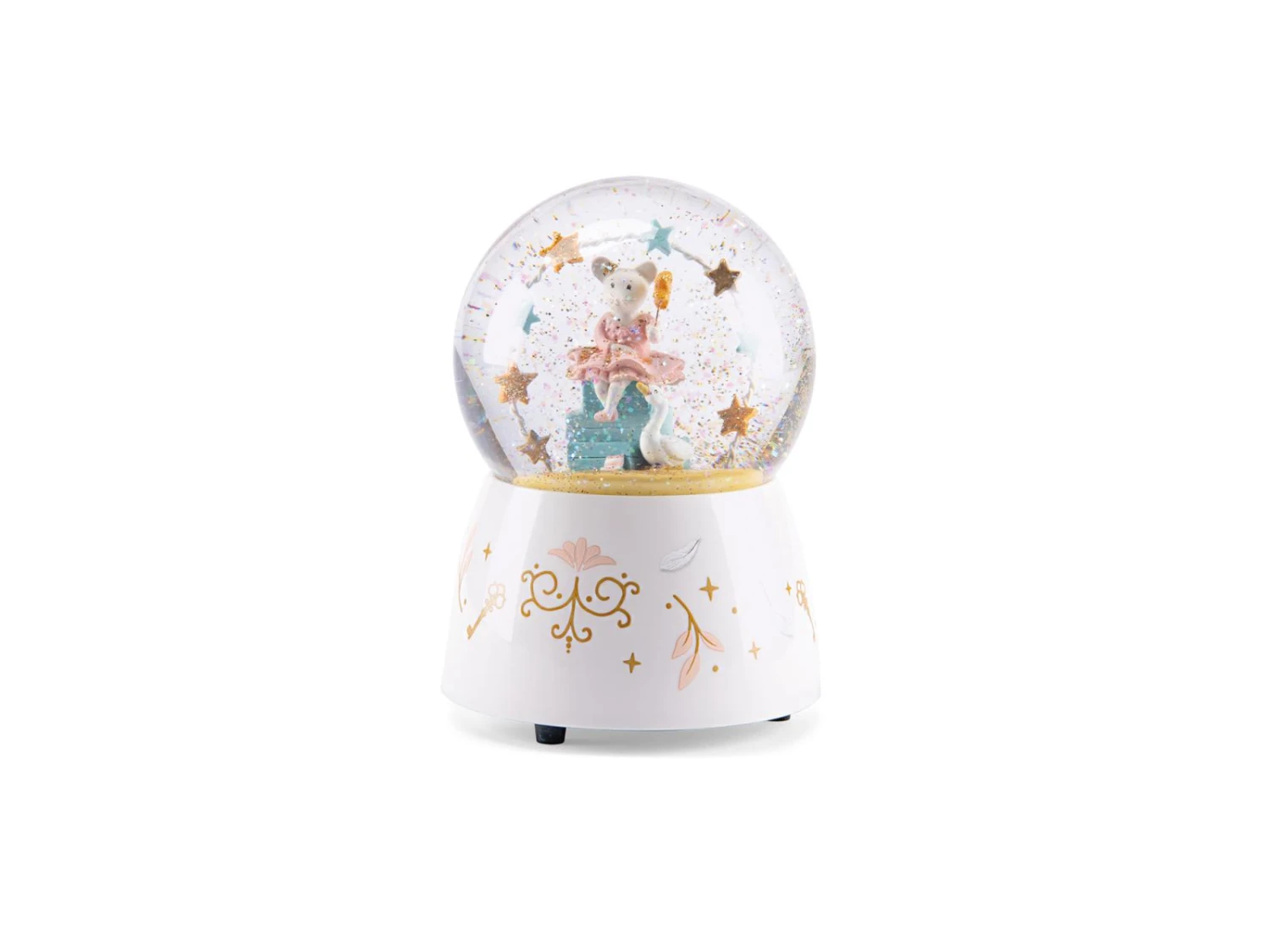 Boule à neige musicale avec la petite souris et son oie qui font la fête au milieu des paillettes holographiques ! En plus de décorer la chambre, une jolie mélodie viendra bercer bébé au moment du coucher… (voir 669241)