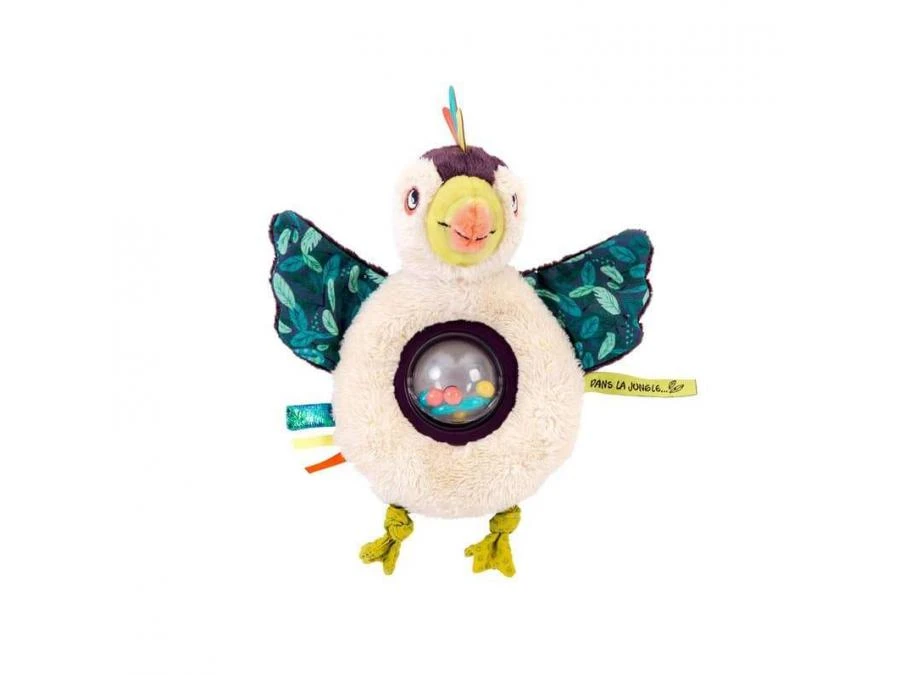 Petit hochet toucan vivement coloré et agrémenté de motifs tropicaux, avec dans son ventre en plastique transparent, des petites billes colorées. L’intérieur de ses ailes renferme du plastique qui fait du bruit quand on les agite…