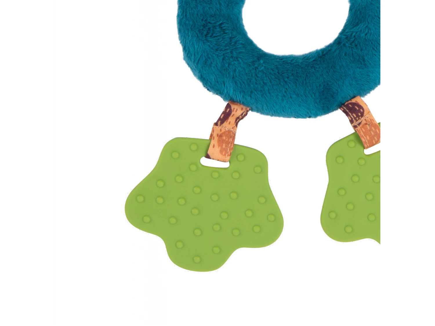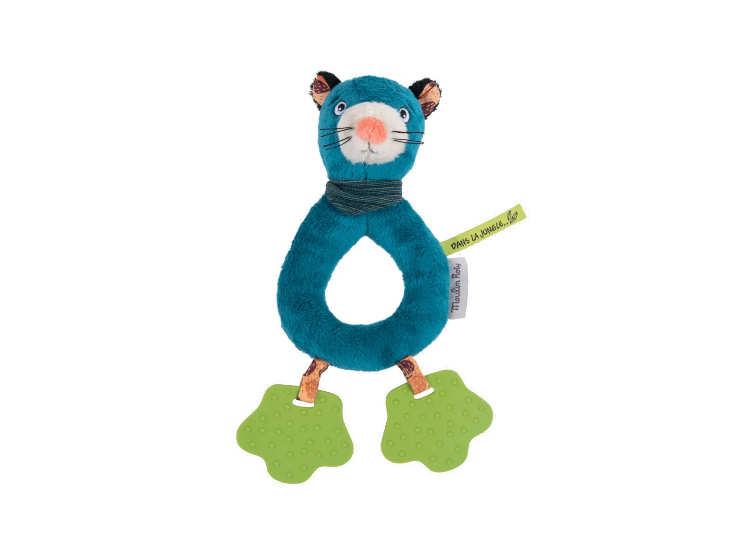 Voici Zimba la plus majestueuse des panthères, transformée en hochet spatules. Facile à saisir grâce à sa forme d’anneau, elle fait du bruit quand on l’agite ! A ses pieds, 2 spatules vertes à machouiller pour soulager les poussées dentaires de bébé.
