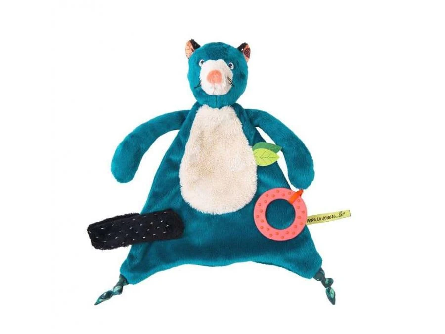 Doudou panthère bleue au jeu de matières et de couleurs, tient dans sa patte un anneau dentaire rouge pour soulager les poussées dentaires de bébé. Sa queue peut s’attacher à la tétine de bébé pour les rendre encore plus inséparables…