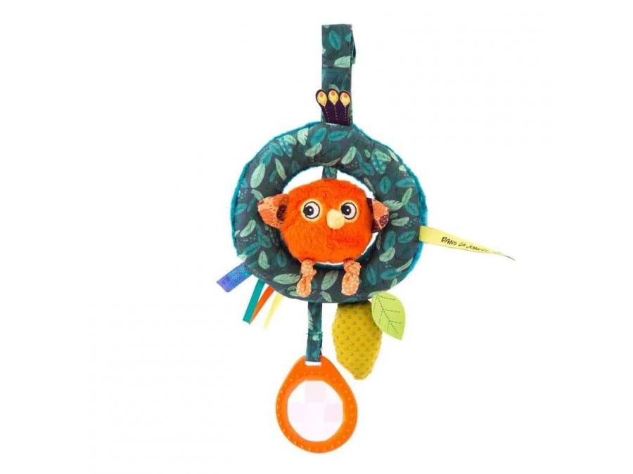 L’anneau d’activités aux motifs feuilles comporte un prisme avec deux perles le long de son cordon, des petits gris-gris et feuilles pour amuser bébé. Au centre, un petit poussin au pelage orange déjanté est bien installé, comme sur une balançoire.