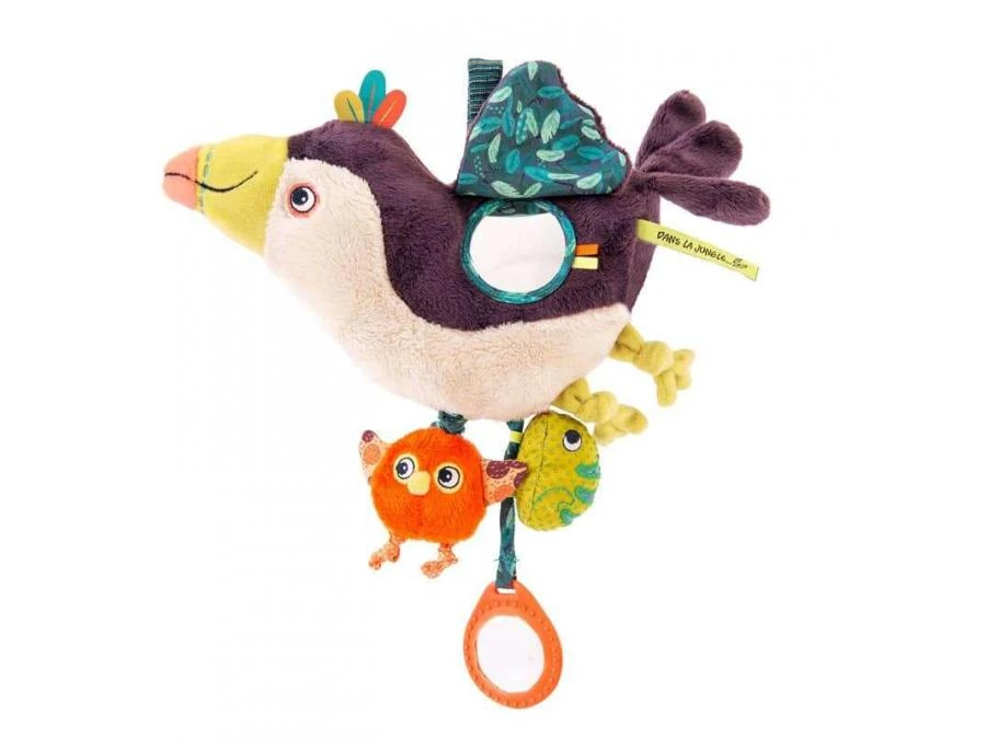 Petit toucan d’activités à suspendre, accompagné par le poussin et le caméléon, ses petits compagnons de jeu. Sur le côté, un miroir, et sous son corps, un prisme suspendu qui amuseront bébé. Des gris-gris colorés ajoutent une touche fun.