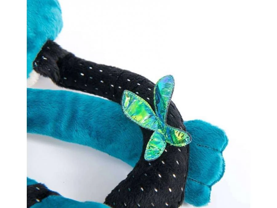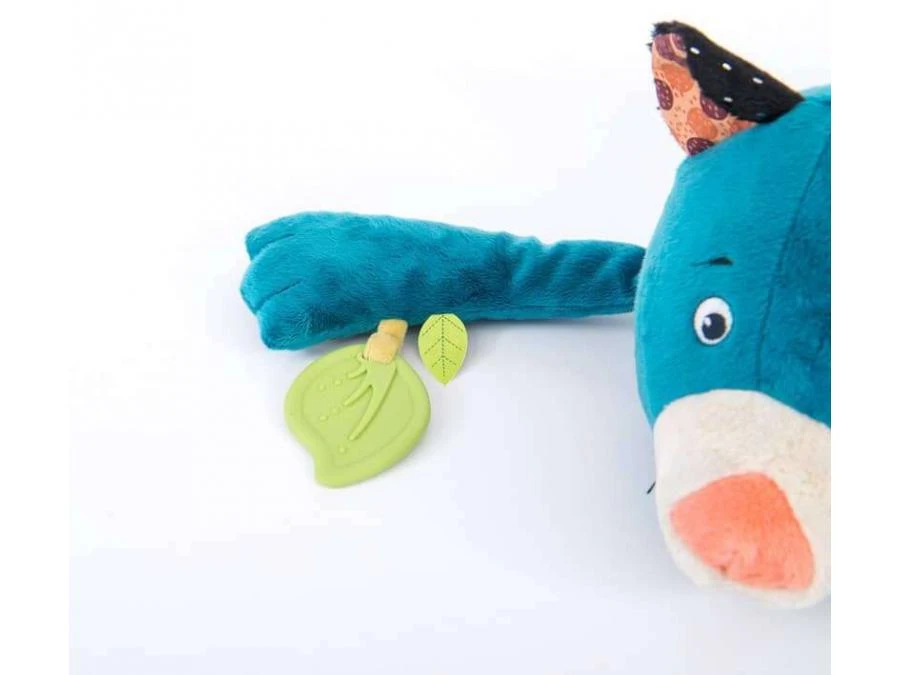 Grande panthère d’activités, accompagnée par son tout-petit, le caméléon et le papillon. Elle comporte un prisme, une spatule dentaire, un miroir, un cordon avec des perles et des petits gris-gris… Son corps est doux et moelleux et peut servir de coussin.