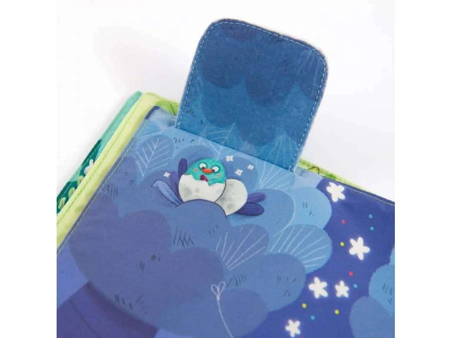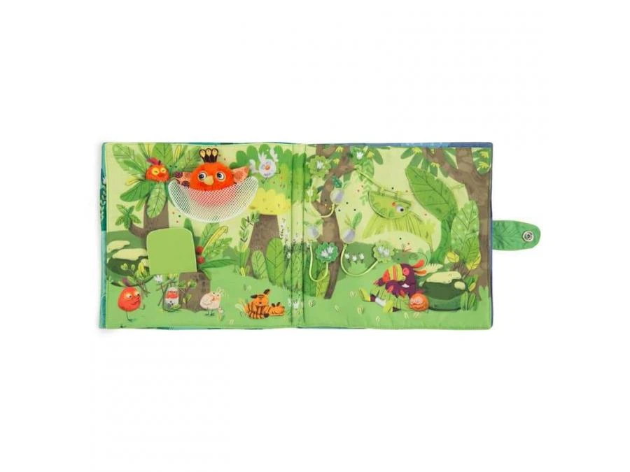 Livre en tissu 6 pages avec un petit poussin chantant à accompagner dans toutes les activités de la jungle ! Jeux de matières à découvrir et éléments à scratcher, il est idéal pour développer la motricité fine !