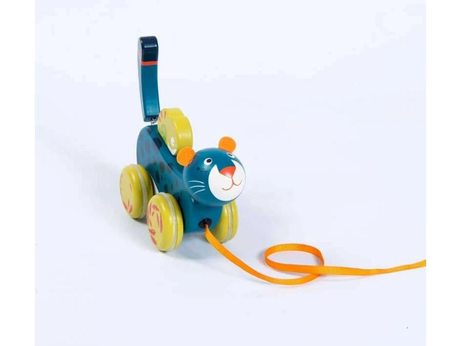 Panthère à tirer en bois, imprimée de motifs de la jungle. Elle repose sur 4 roues désaxées reproduisant le mouvement de ses foulées, et sa queue tenue par un ressort, se met à bouger ! L’enfant jouera aussi avec son ami caméléon tenu par un élastique.