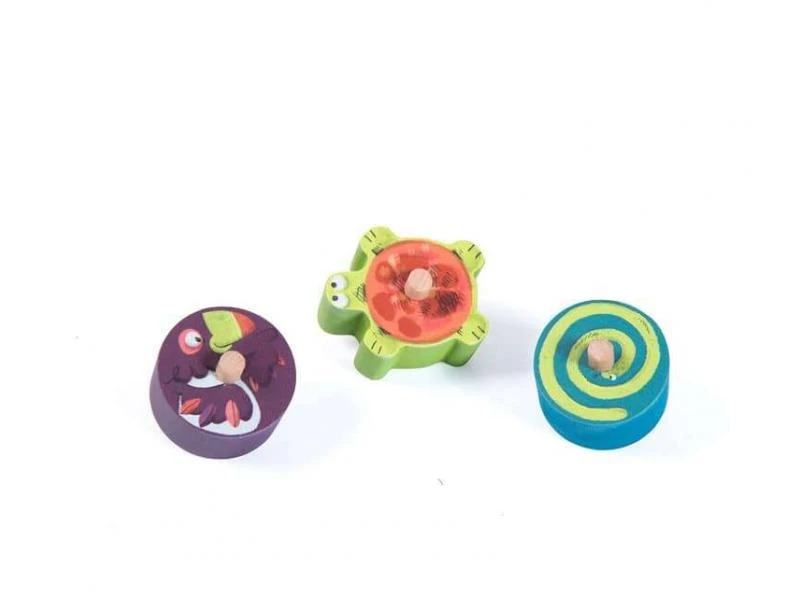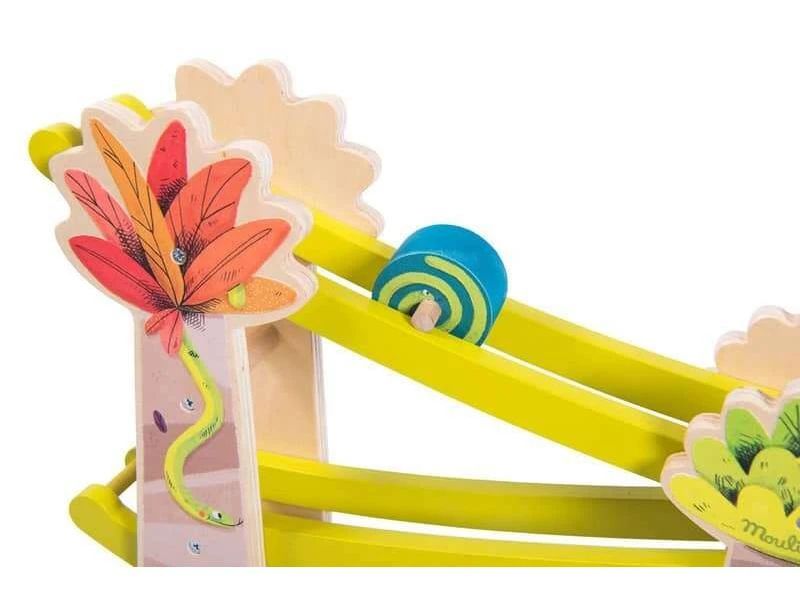 Les toupies dévalent les pentes de la jungle ! Cette cascade est composée de passerelles inclinées reliant deux baobabs en bois, où se laissent rouler les toupies toucan, serpent, et tortue. Leur terrain de jeu préféré !