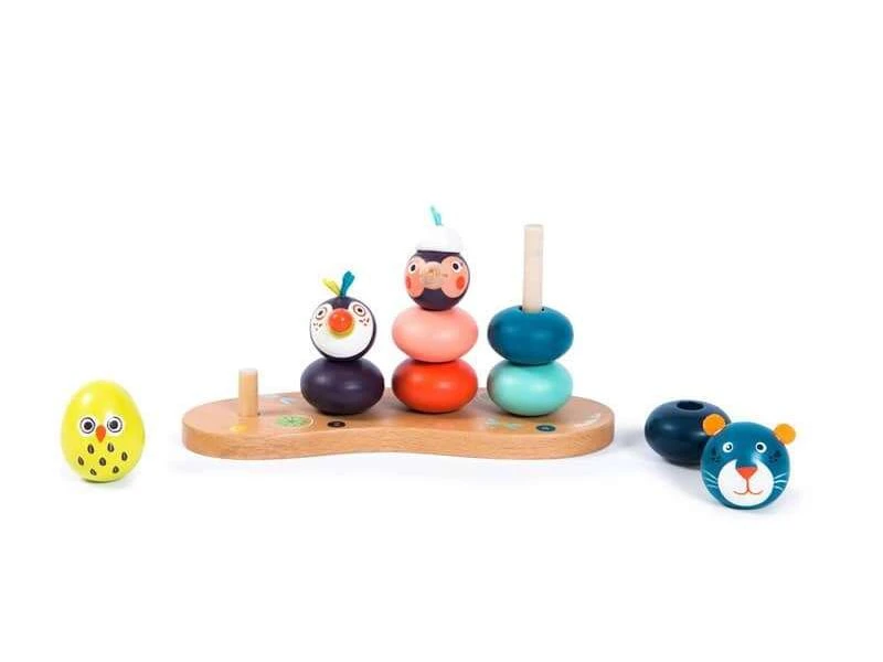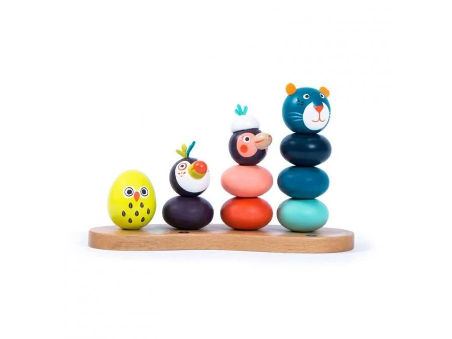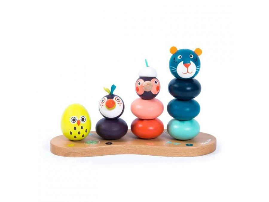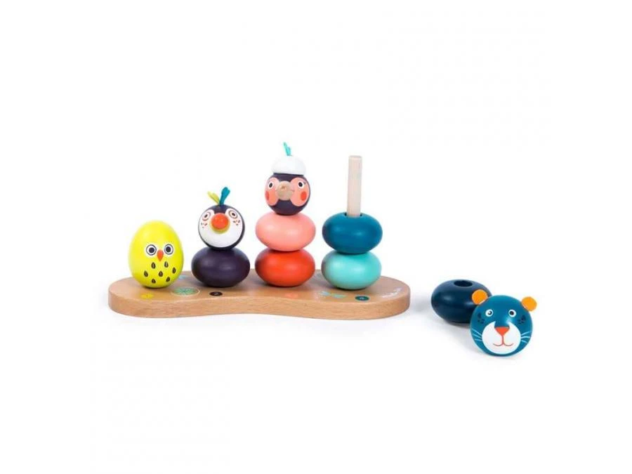 Empilable multi-activités pour développer la capacité de l’enfant à manipuler et compter. Sur un socle en bois, empilez les parties en bois coloré pour recomposer les animaux de la jungle : la panthère, l’oiseau, le toucan et l’œuf… ou mélangez-les !