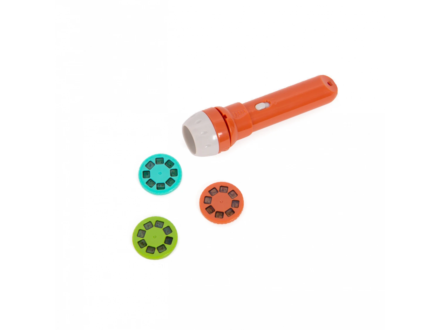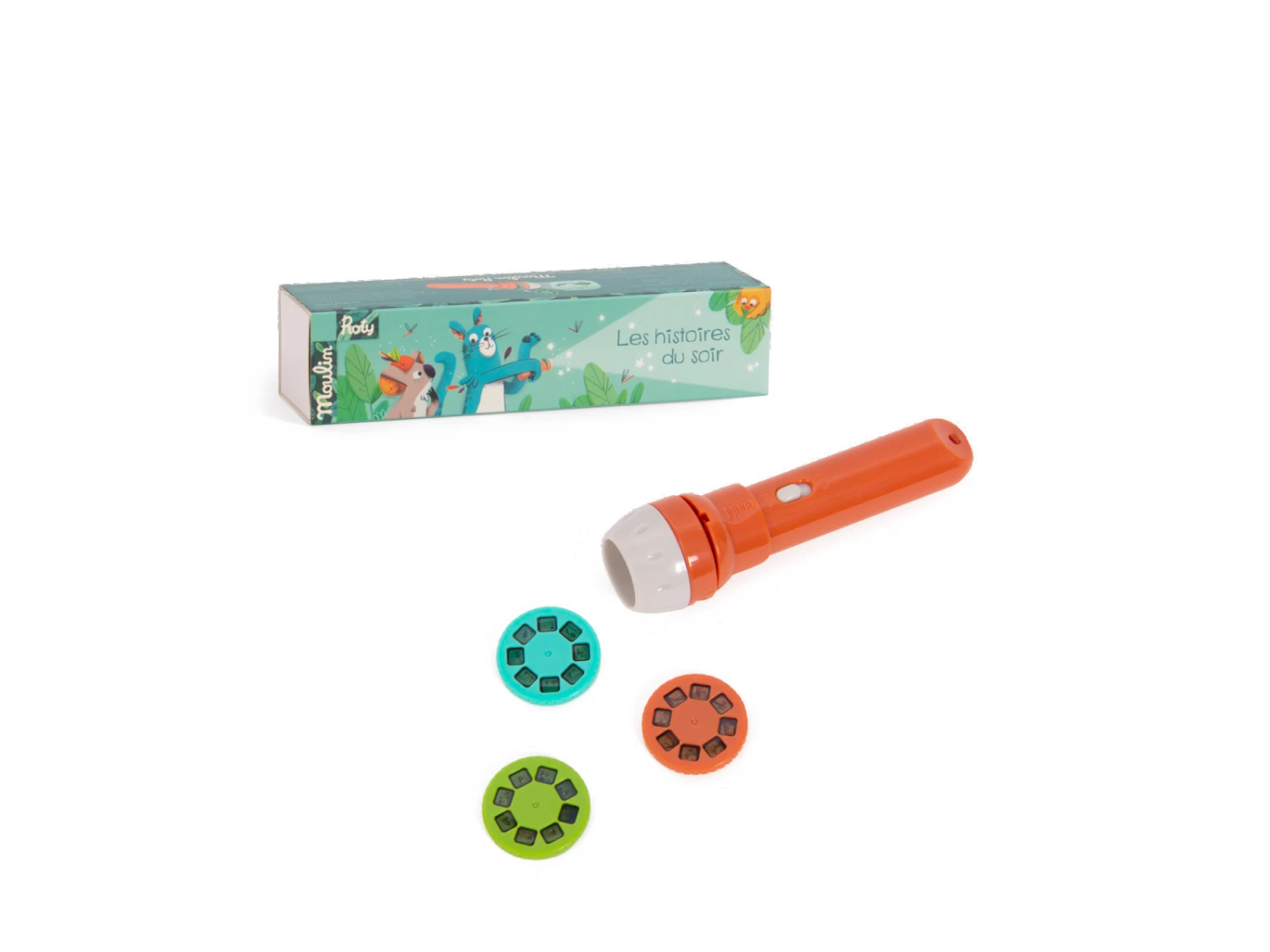 Lampe torche de poche où chacun des 3 disques projetés sur le mur raconte une histoire. Elles racontent les aventures joyeuses et colorées des amis de la Jungle. Un instant magique pour développer l’imagination des enfants…