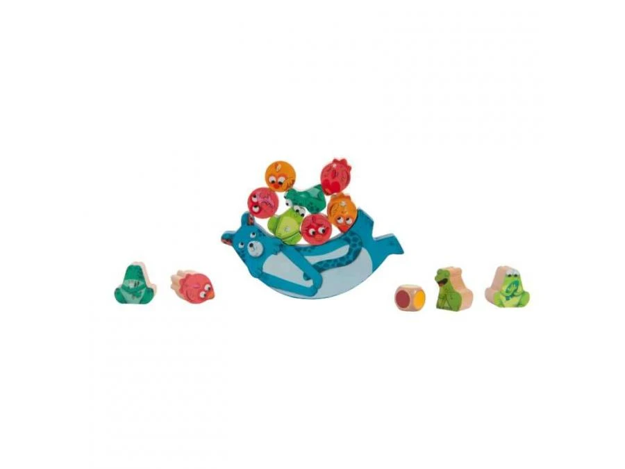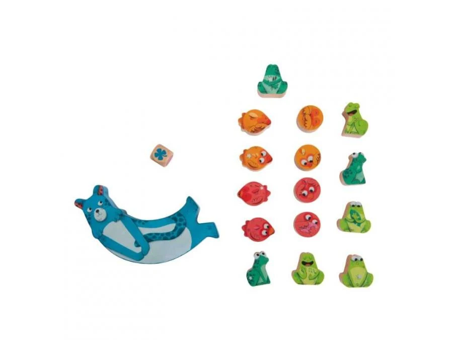 Lance le dé et essaye d’empiler les 15 pièces en bois, illustrant les joyeux habitants de la jungle. Le dé lancé affiche la couleur à placer en équilibre sur Zimba la panthère. Prends garde à ne pas tout faire tomber !