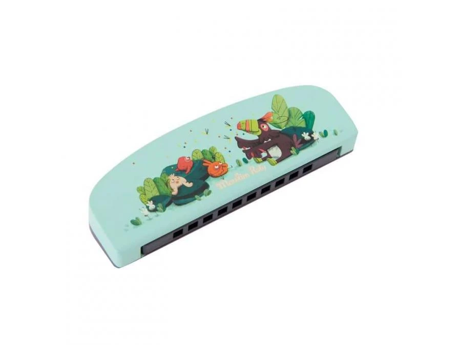 Harmonica en bois peint : un cĂ´tĂ© nuit avec les animaux de la jungle au repos, l’autre couleur vert d’eau avec Pakou le toucan et ses amis poussins. Il dĂ©veloppera l’Ă©veil musical des tout-petits.