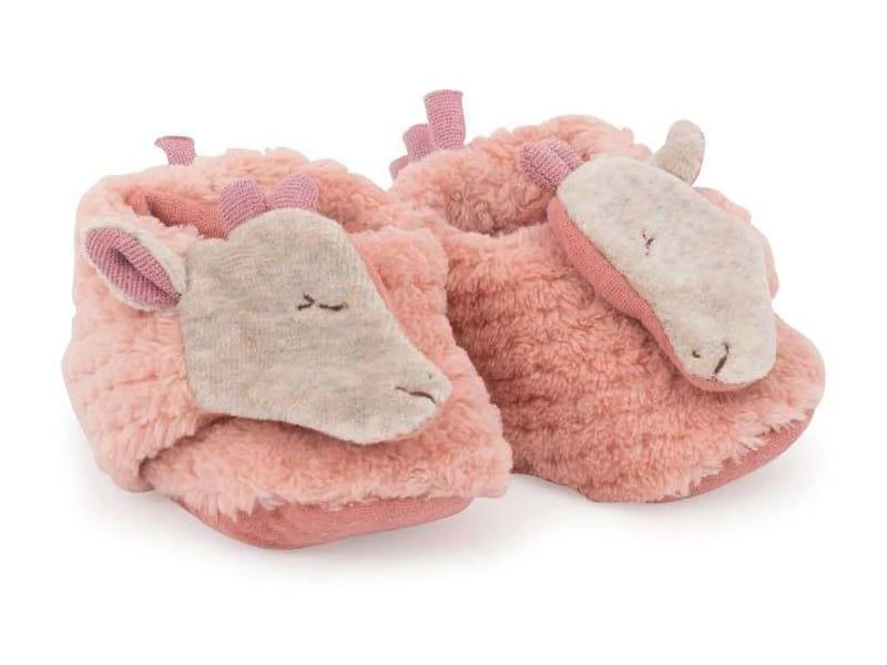 Petits chaussons en velours éponge chiné et fourrure rose toute douce, fermeture velcro sur le dessus. Comme deux girafes endormies, leurs yeux et bouches sont finement brodés… La paire est vendue dans une jolie boîte cadeau illustrée à l’aquarelle.