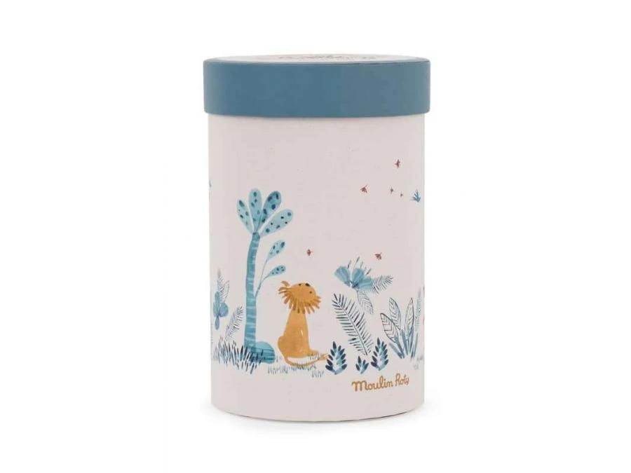 Paprika le lion nous offre un grand sourire et plein de curiosités au toucher : de longues pattes à attraper, une crinière et des moustaches à tortiller, et un corps moelleux pour se reposer… Il est installé dans une jolie boîte cadeau toute en rondeur.