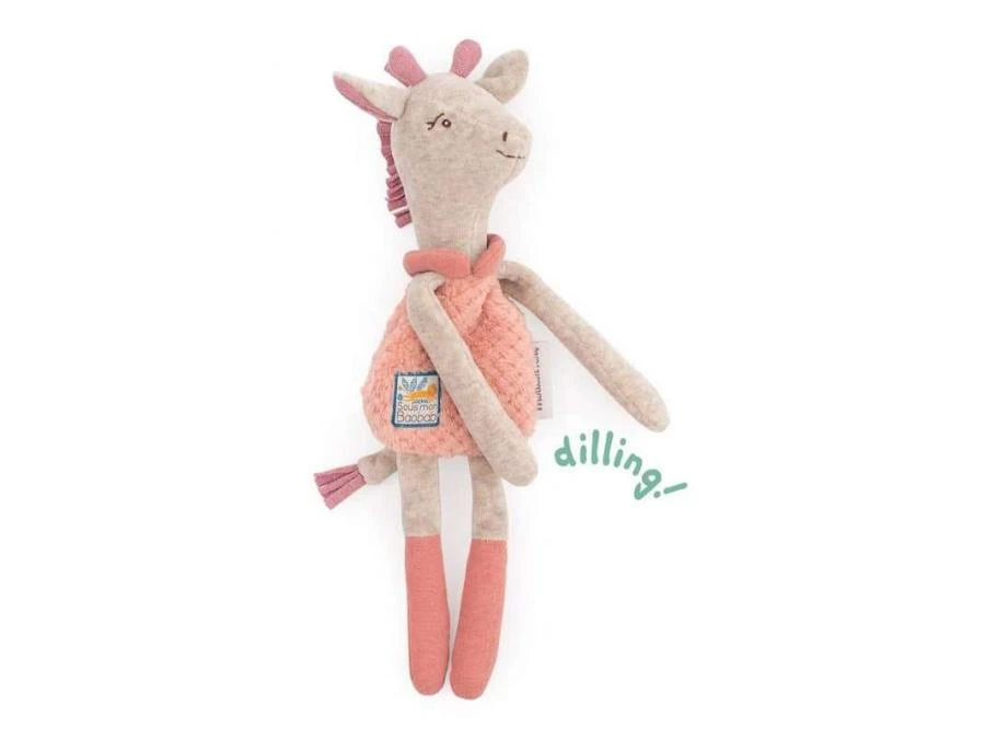 Un hochet girafe pour jouer, avec des cornes et de longues pattes à attraper, mais aussi un corps en fourrure toute douce pour de tendres instants câlins.