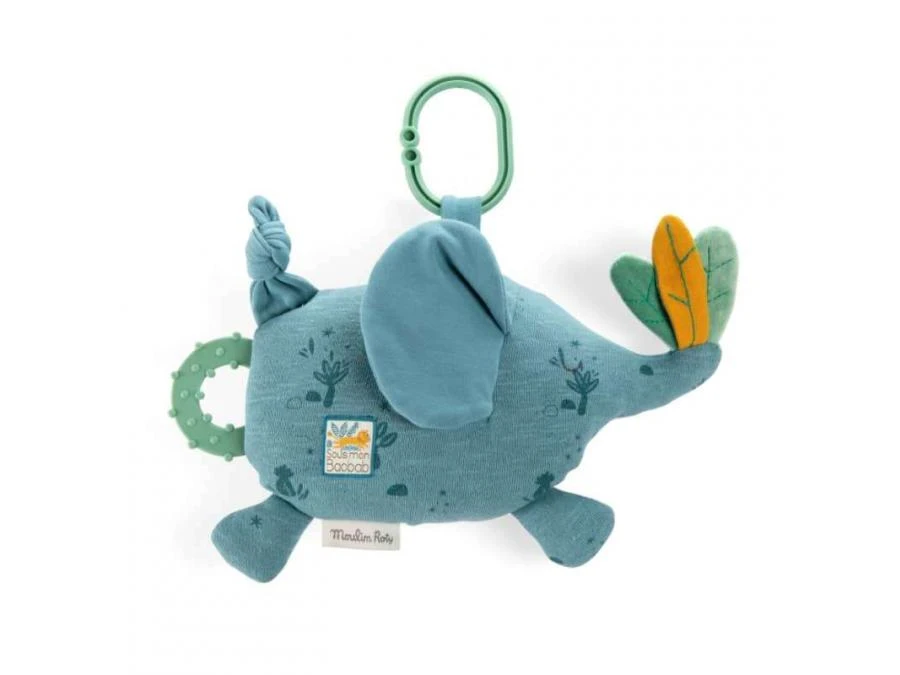 Elephant à suspendre aux couleurs de la savane qui propose différentes activités avec dans son ventre une clochette qui fait glong, un miroir bien caché, des petites feuilles sur le bout de la trompe qui font scritch et un jouet de dentition.