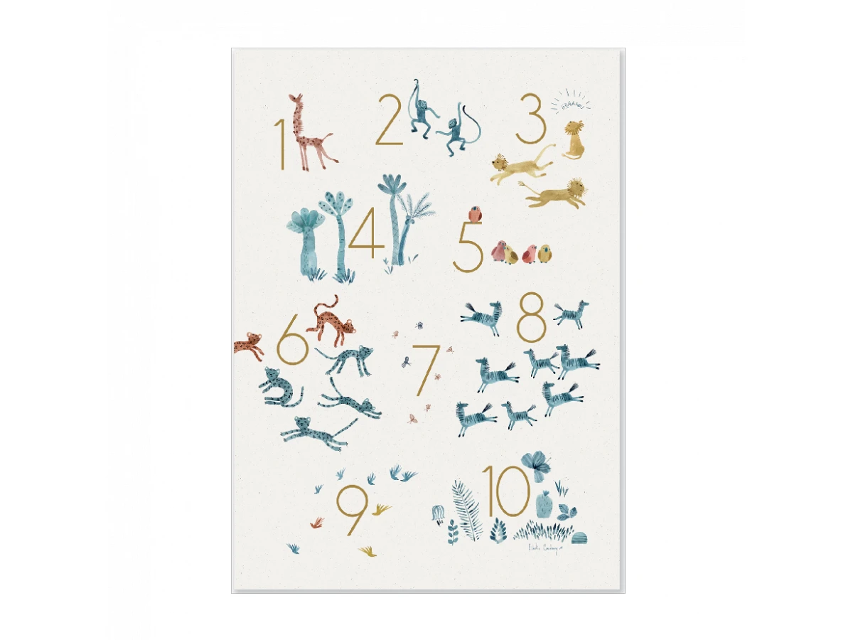 Affiche 50x70cm de la collection Sous mon Baobab. 1,2 3 4 … Combien y-a-t-il de lions ? de zèbres ? Pour découvrir les chiffres et apprendre à compter. Illustrée par Élodie Coudray. Imprimé en France à base d’encres végétales sur du papier certifié FSC.