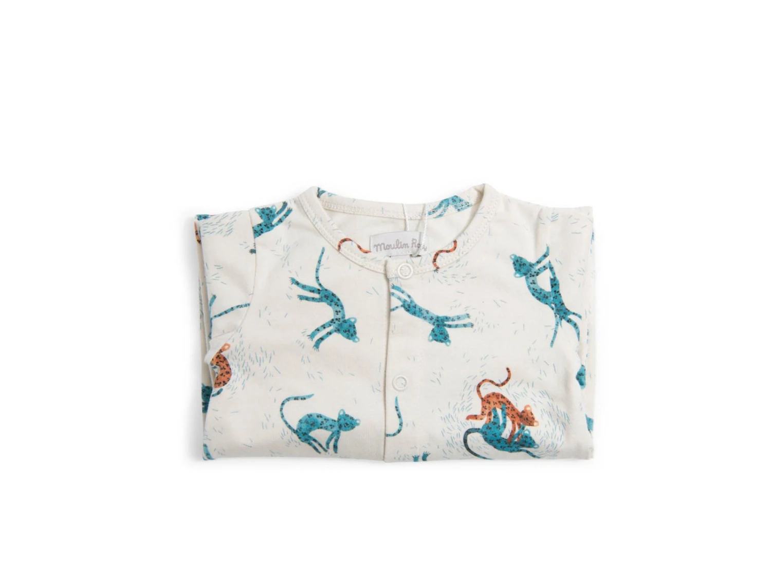 Pyjama 1 mois en jersey de coton crème à motifs guépards, avec ouverture en Y par boutons-pression sur le devant et encolure en rond. Il enveloppera bébé de douceur pour toute la nuit.