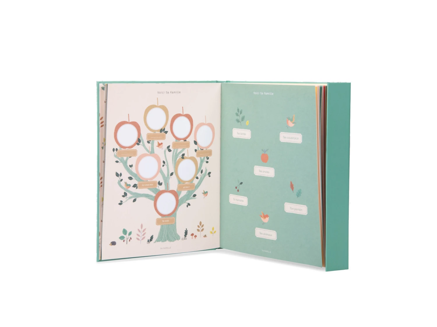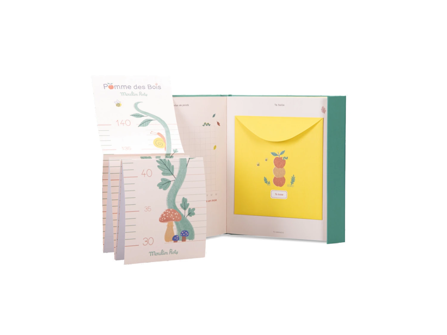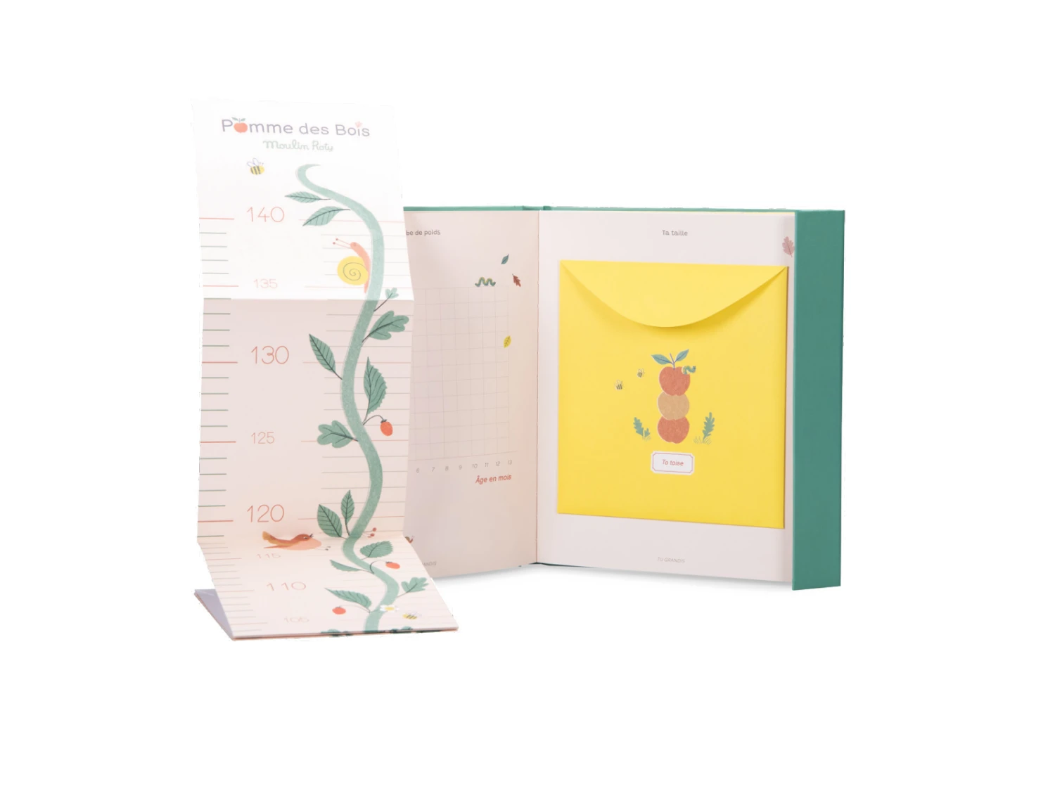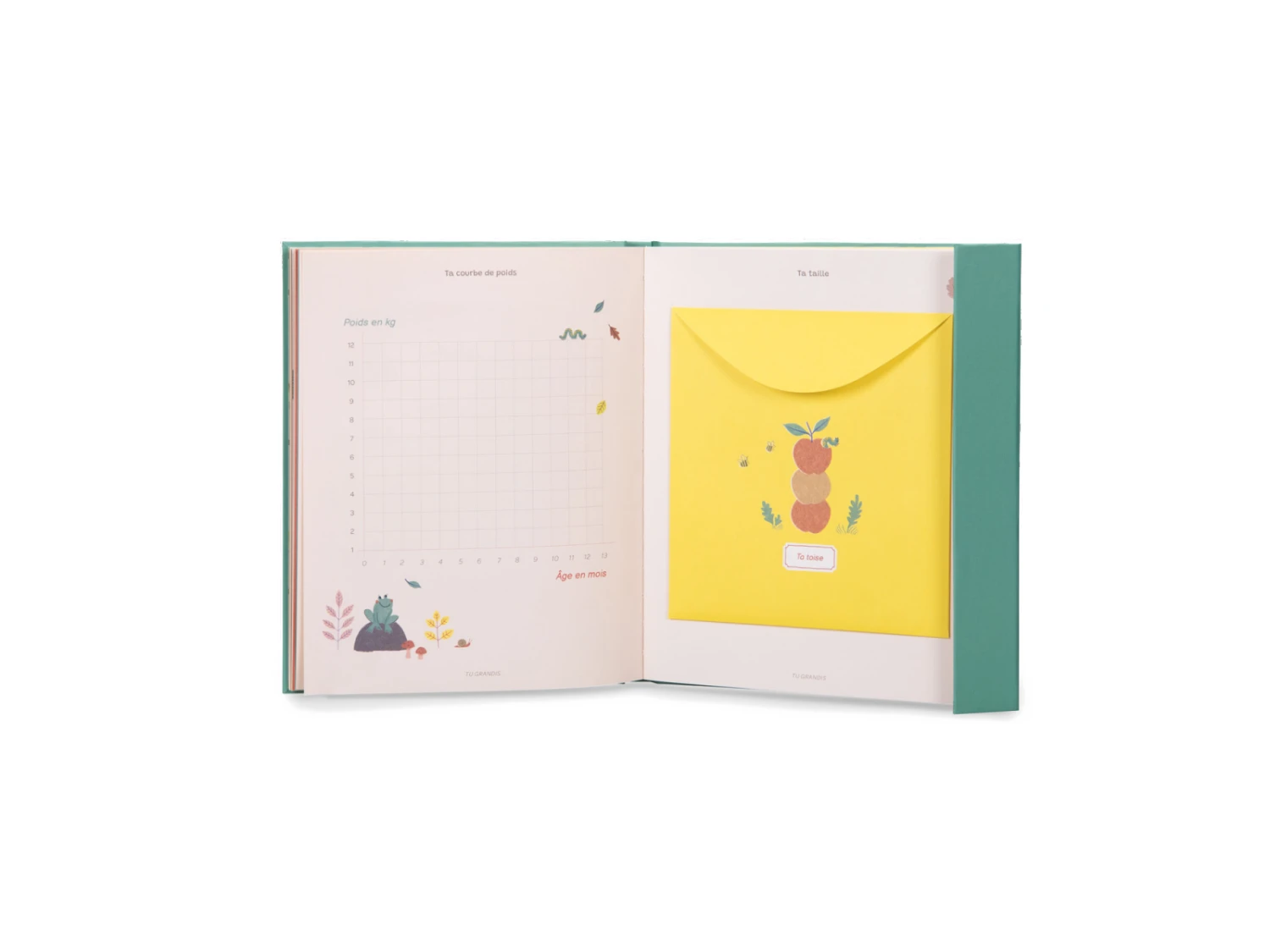 Ce livre à trésors de 80 pages illustrées accompagne les enfants de ses premiers jours à ses 6 ans. Un recueil de mots et d’images, avec 6 enveloppes à souvenirs et 1 toise en cadeau. Fermeture aimantée, et textes non genrés pour l’enfant et les parents.
