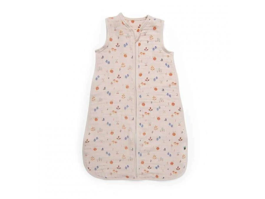 Gigoteuse 6-24 mois (TOG 1) en coton biologique pour laisser respirer la peau de bébé, avec imprimé cueillette. Fermeture à glissière et boutons-pression pour un habillage facile.