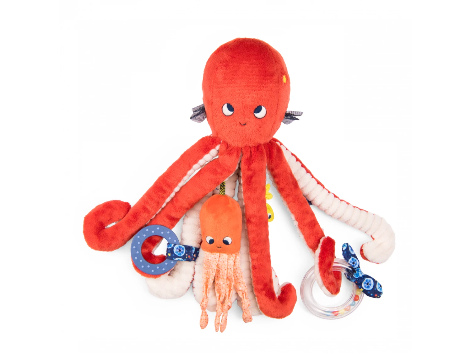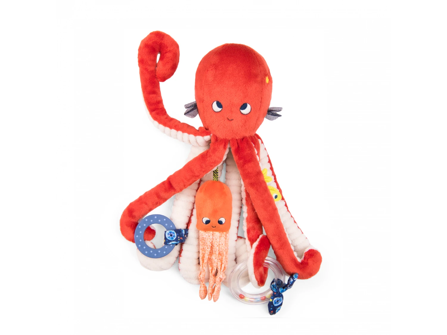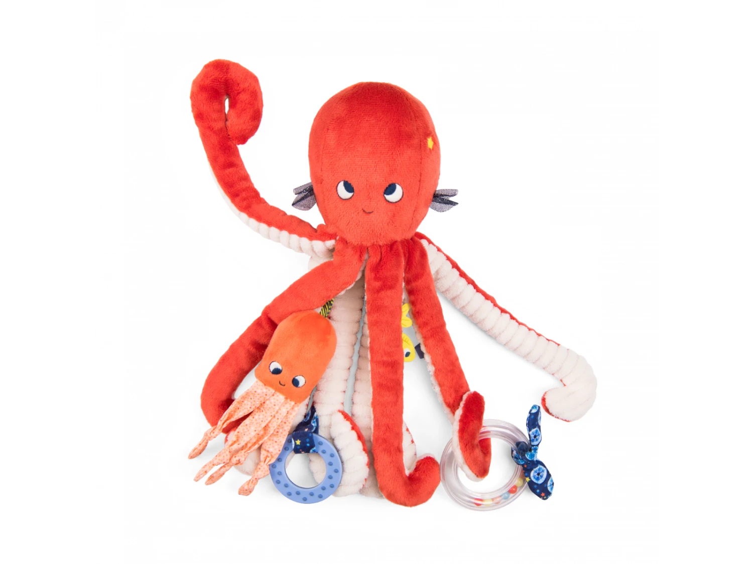 Paulie le poulpe cache dans ses 8 tentacules au tissu côtelé de nombreuses activités : grelots, anneau à billes colorées, étiquettes et nouette à saisir, anneau de dentition et même un petit compagnon hochet, niché au creux de ses bras.