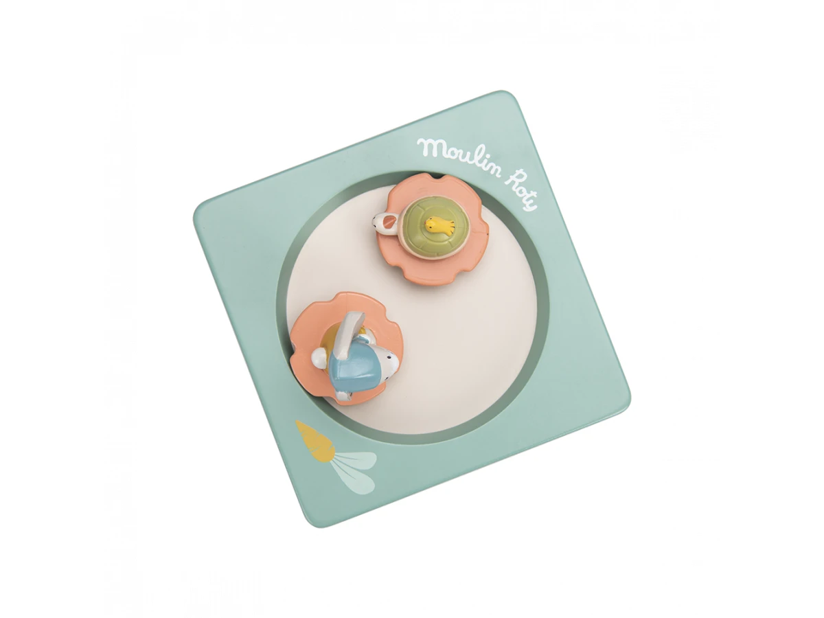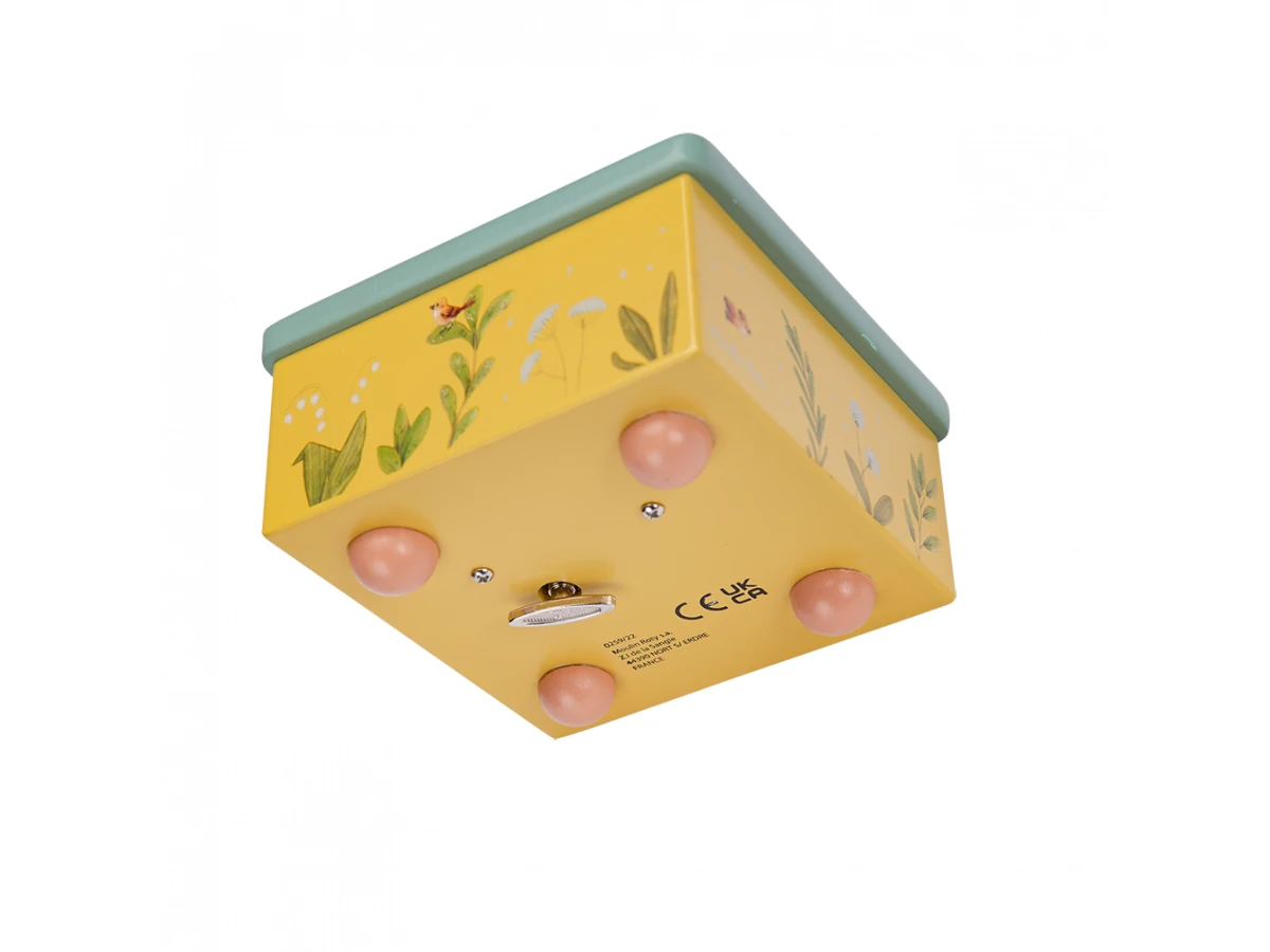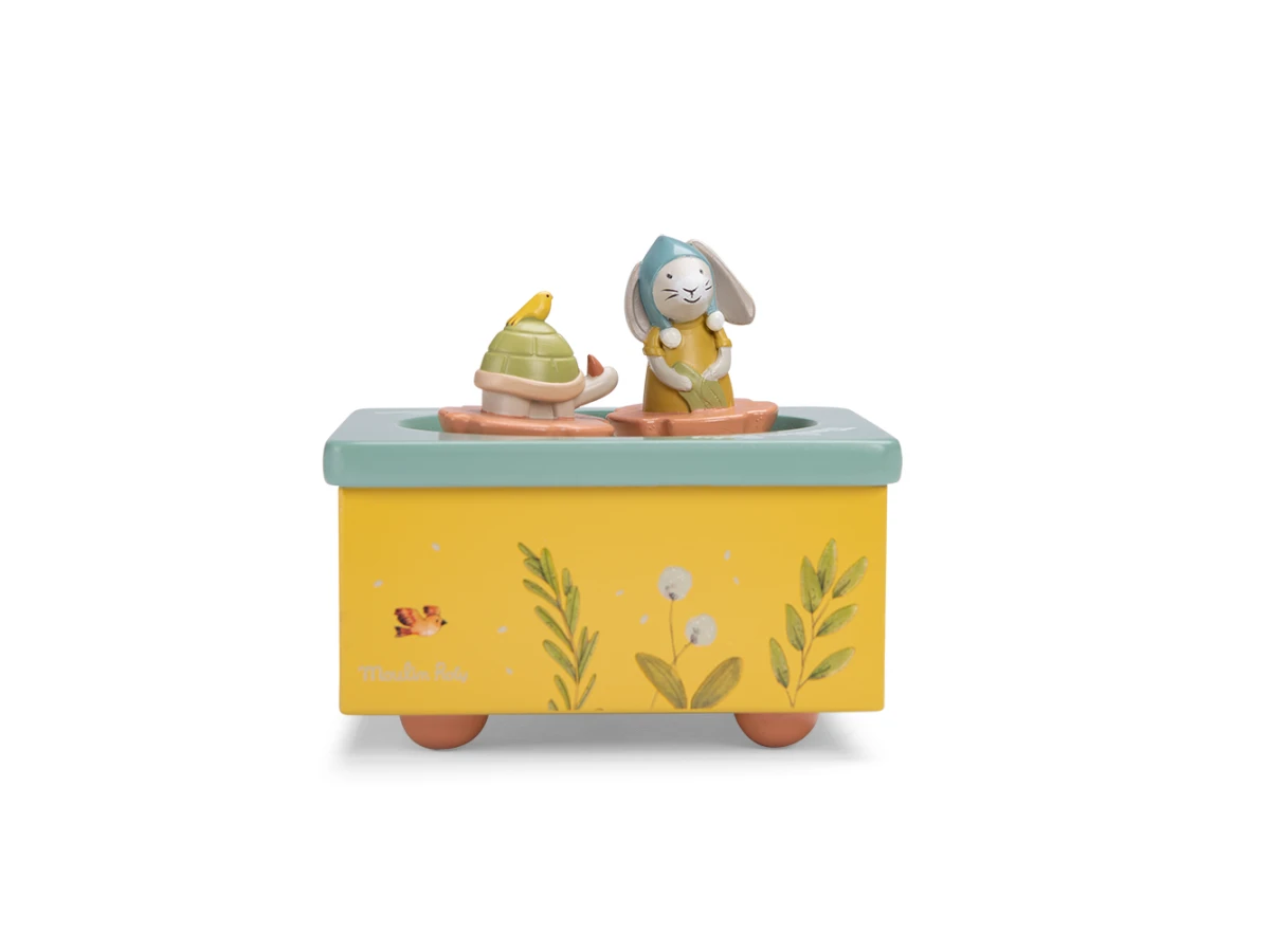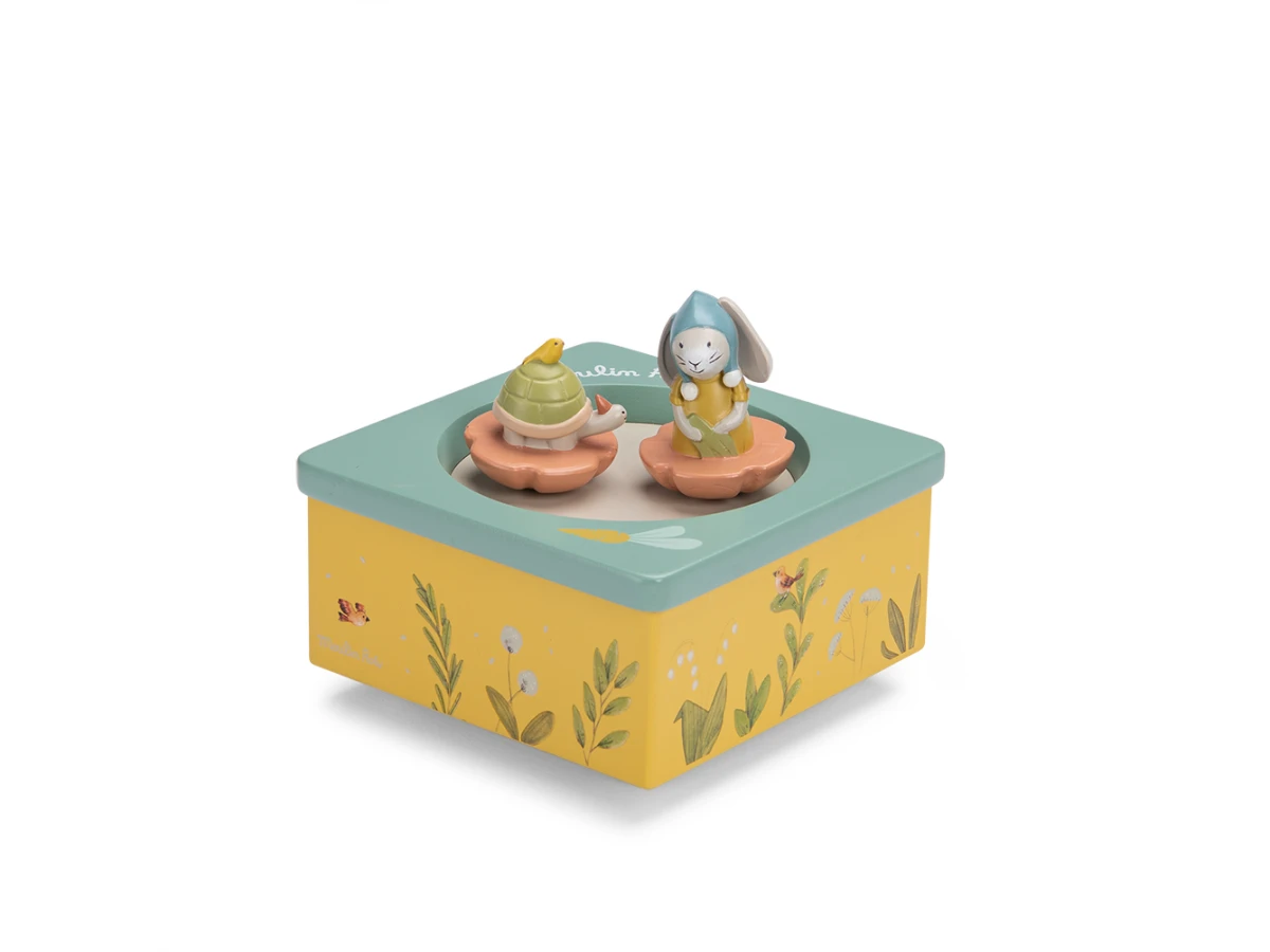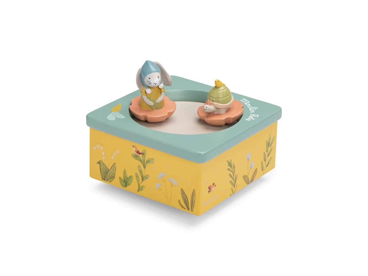 Boîte à musique aux couleurs de la gamme, illustrée d’un joyeux paysage composé de plantes, légumes et petits oiseaux du jardin. Le lapin et la tortue tournent et dansent sur la piste pour bercer et endormir bébé.
