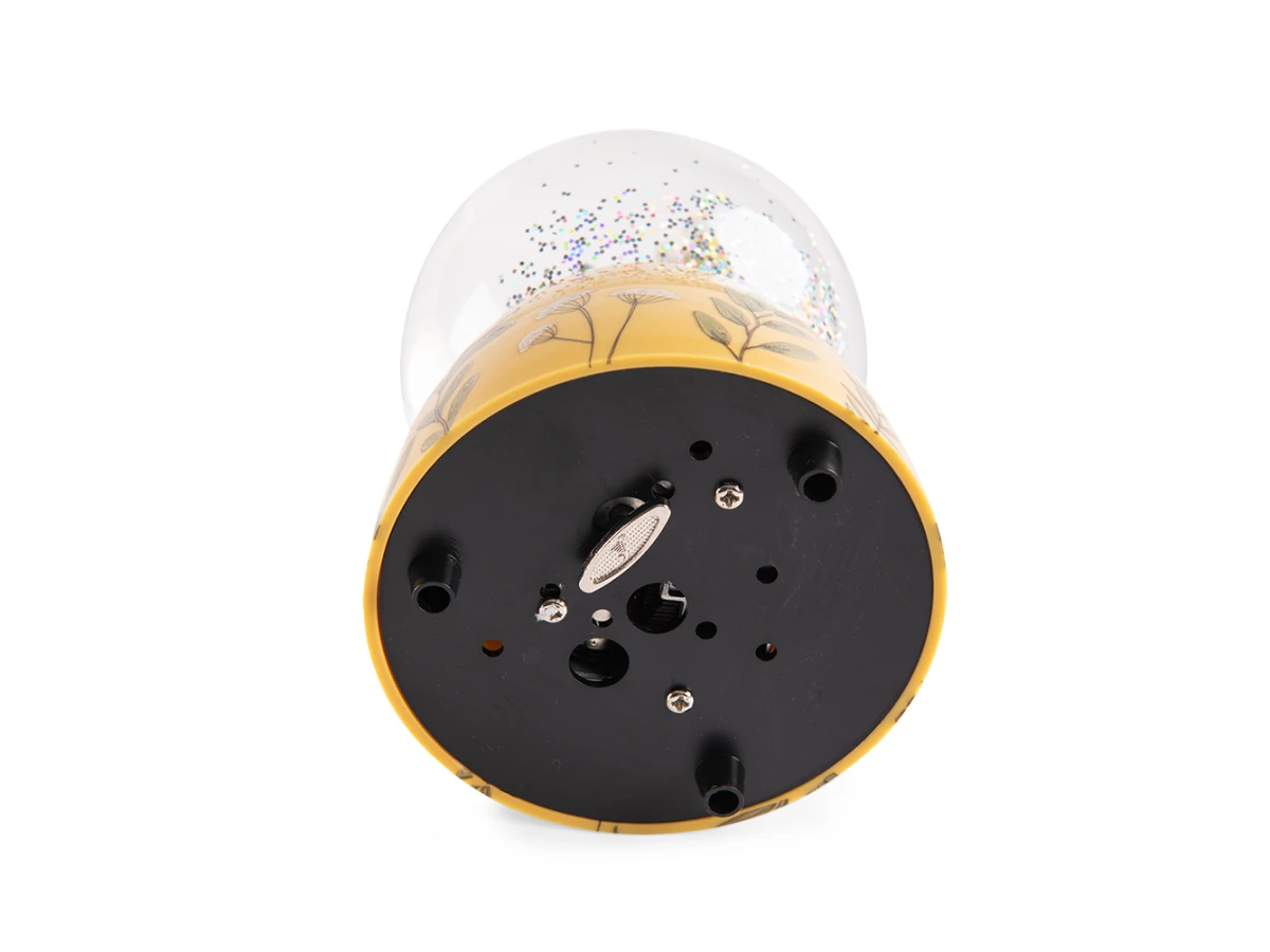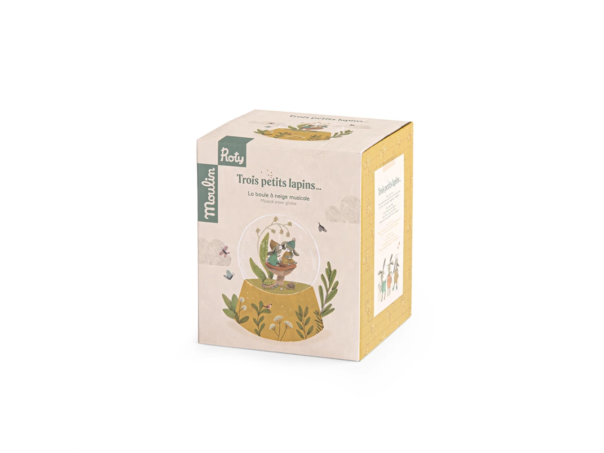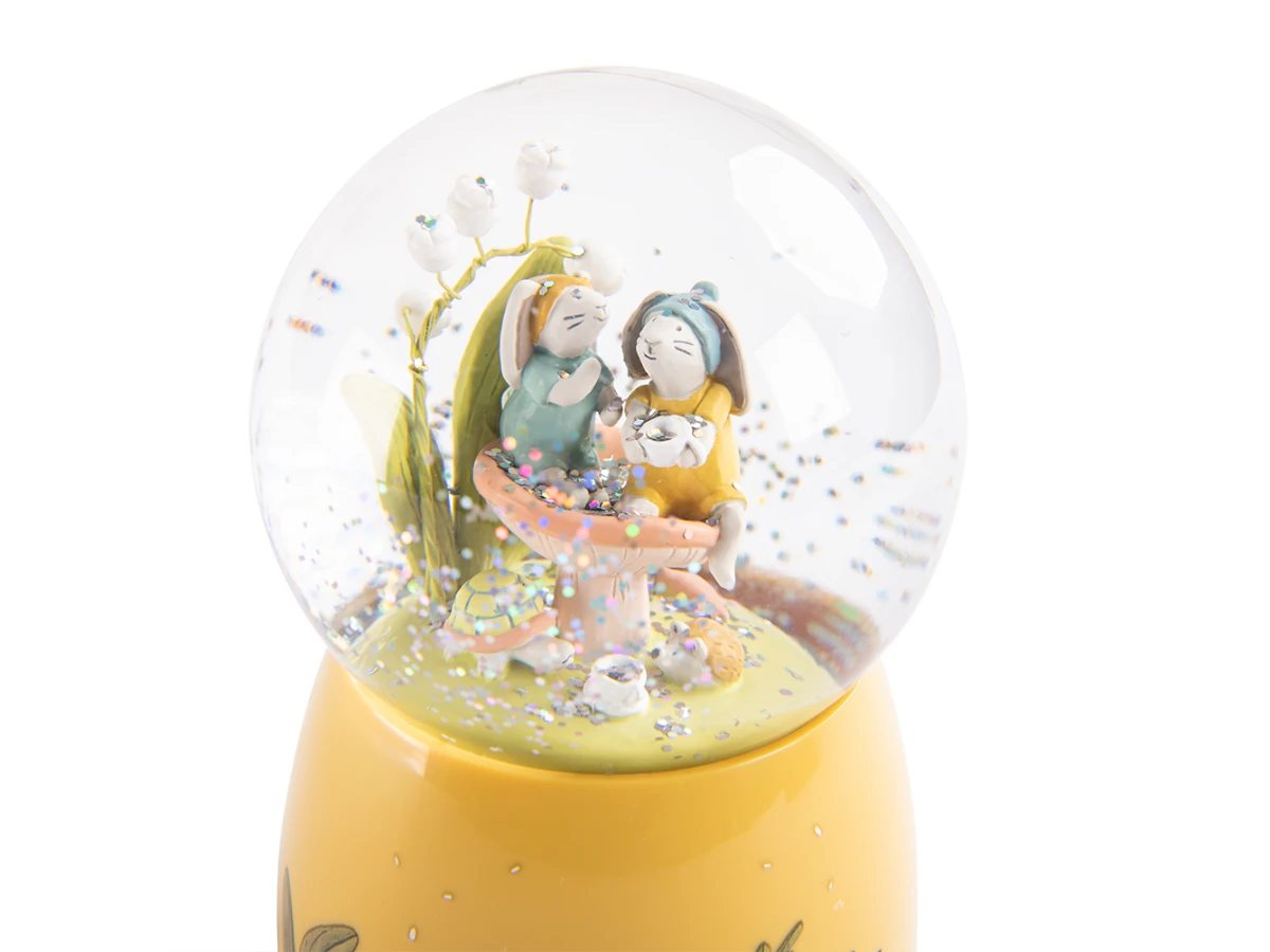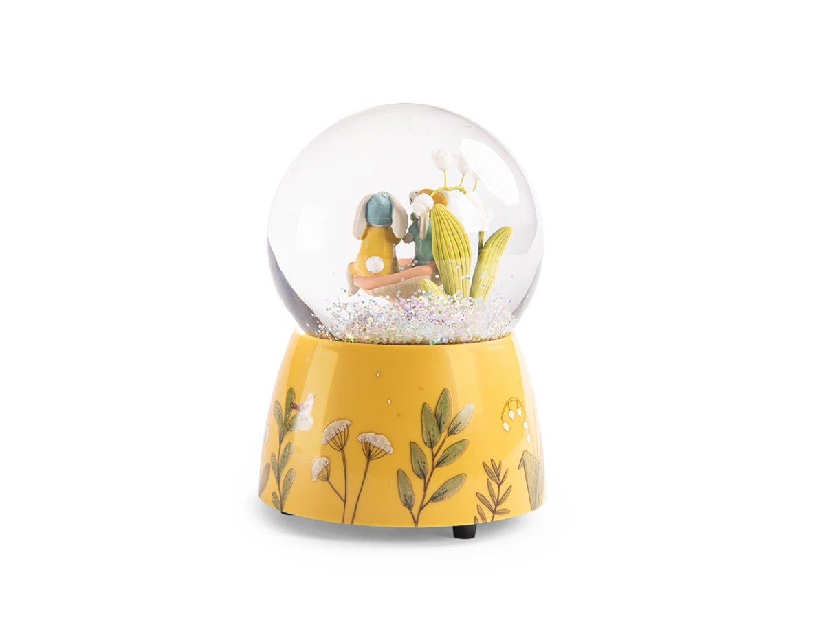 Boule à neige représentant 2 petits lapins et leurs amis. Les voilà au jardin, au milieu des paillettes holographiques, partageant le thé, assis sur un champignon ! En plus de décorer la chambre, une jolie mélodie viendra bercer bébé au moment du coucher…