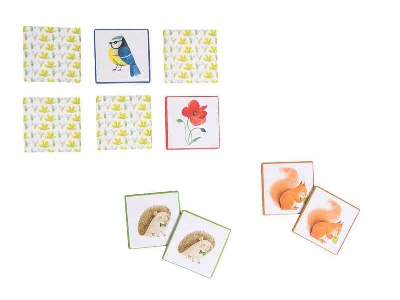 Le mémo de la nature comportant un jeu de 36 paires de cartes illustrées des éléments du jardin : feuille, châtaigne, coccinelle, coquelicot…