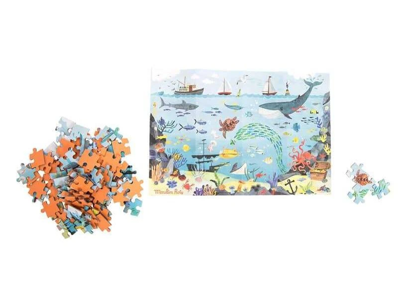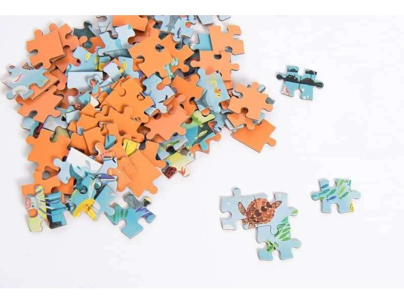 Un puzzle de 96 pièces illustrant à l’aquarelle la vie fantastique des animaux dans l’océan… Le puzzle est rangé dans un joli tube illustré où l’on retrouve un poster avec un imagier au dos, et une loupe pour observer la scène de plus près !