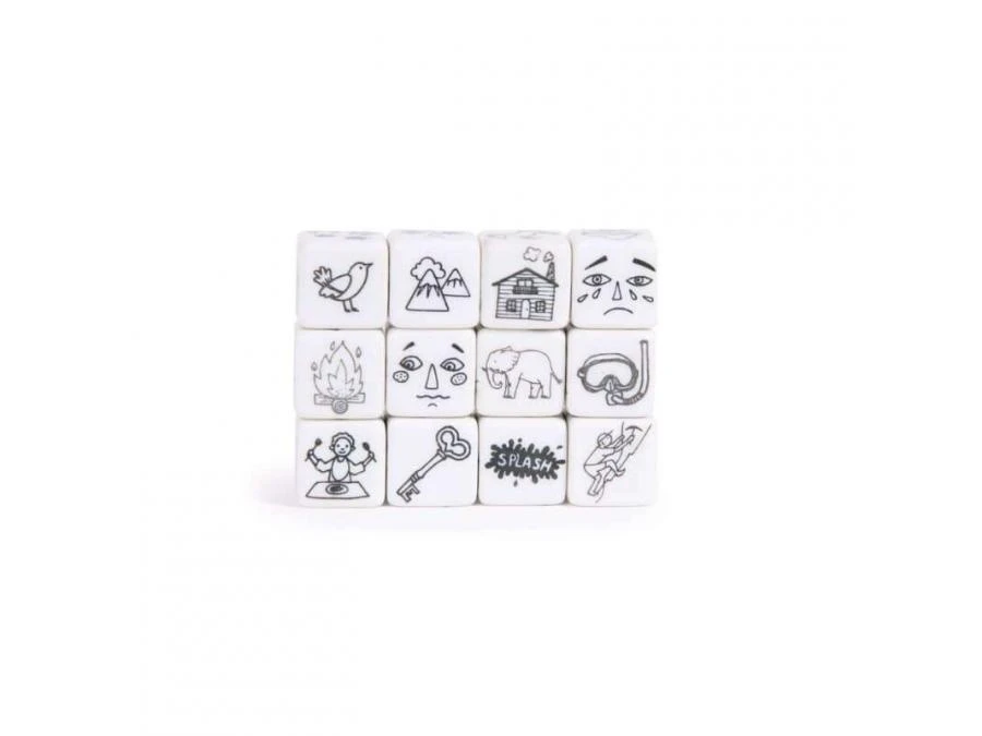 Parfaits pour la veillée au coin du feu : 12 dés illustrés à lancer simultanément ou chacun son tour pour inventer une histoire collectivement, ou à compléter l’un après l’autre. Pas de perdant ni de gagnant, seulement des histoires à inventer !