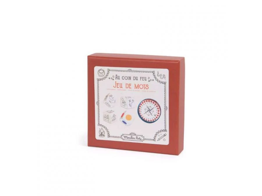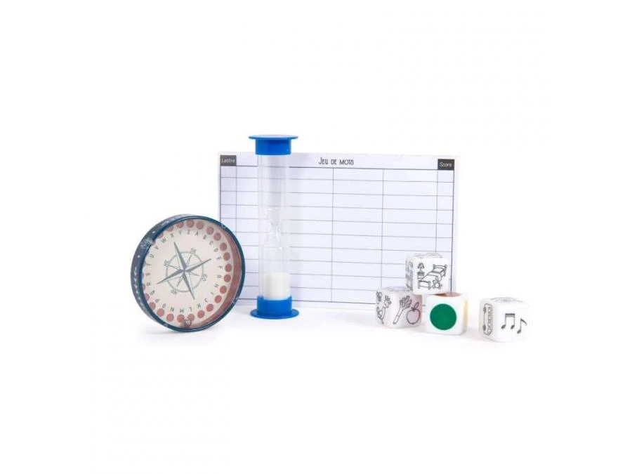Pour s’amuser pendant la veillée au coin du feu : 4 dés à thème, 1 boîte alphabet et des carnets de notes pour trouver des mots correspondants au thème et à la lettre choisie, dans la limite du sablier ! À jouer en mode compétition ou collaboration.