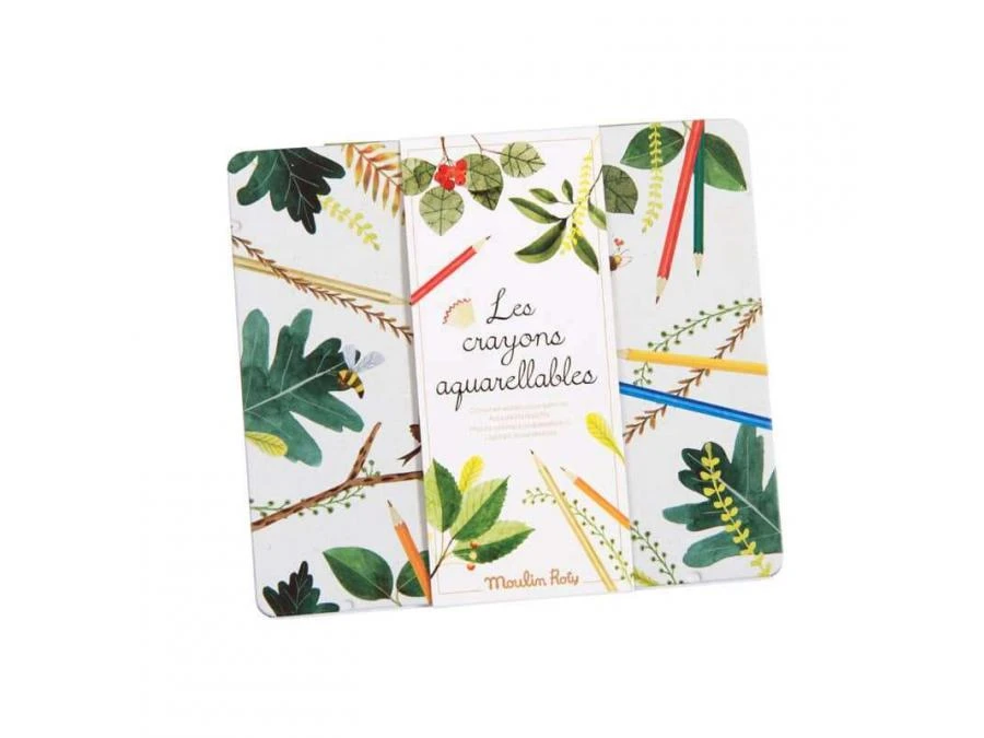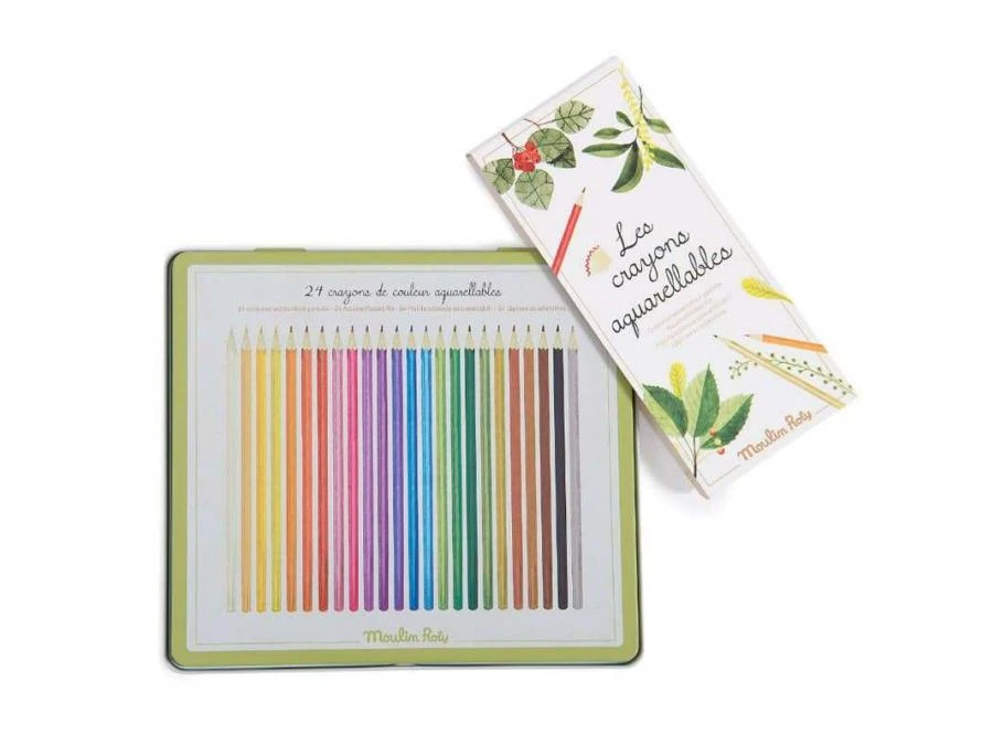 24 crayons aquarellables en bois aux couleurs vives, dans leur boîte en métal illustrée. Ils peuvent être utilisés comme crayons de couleur classiques, ou en faisant un bel effet aquarelle en les trempant dans l’eau ou en passant un pinceau humide.