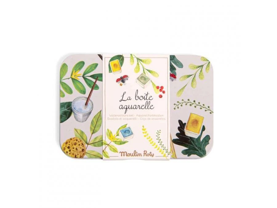 Boîte en métal avec 24 godets aquarelles aux couleurs intenses, un pinceau avec réservoir d’eau et une éponge. La boîte servira également de palette pour créer des mélanges de couleurs. Le kit idéal pour les artistes fans de nature !