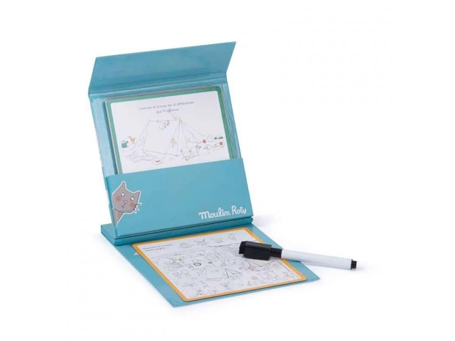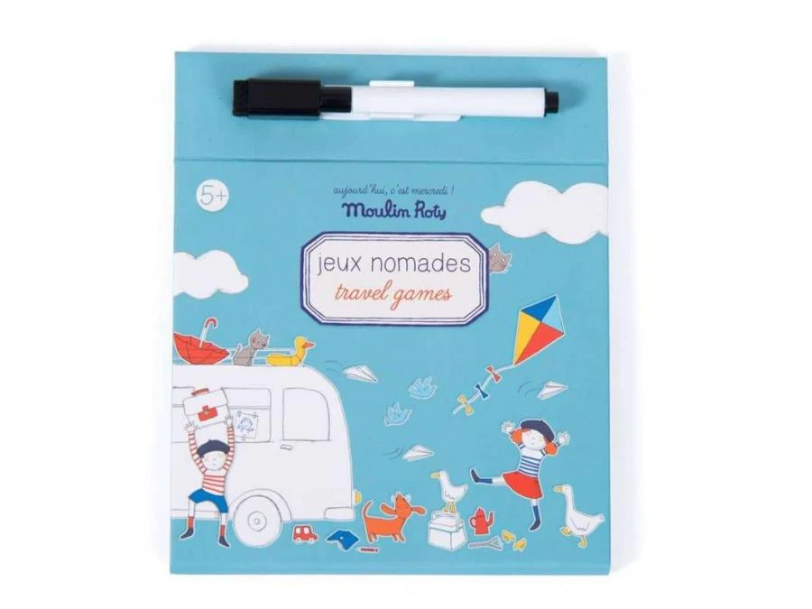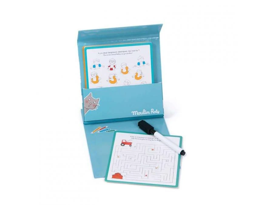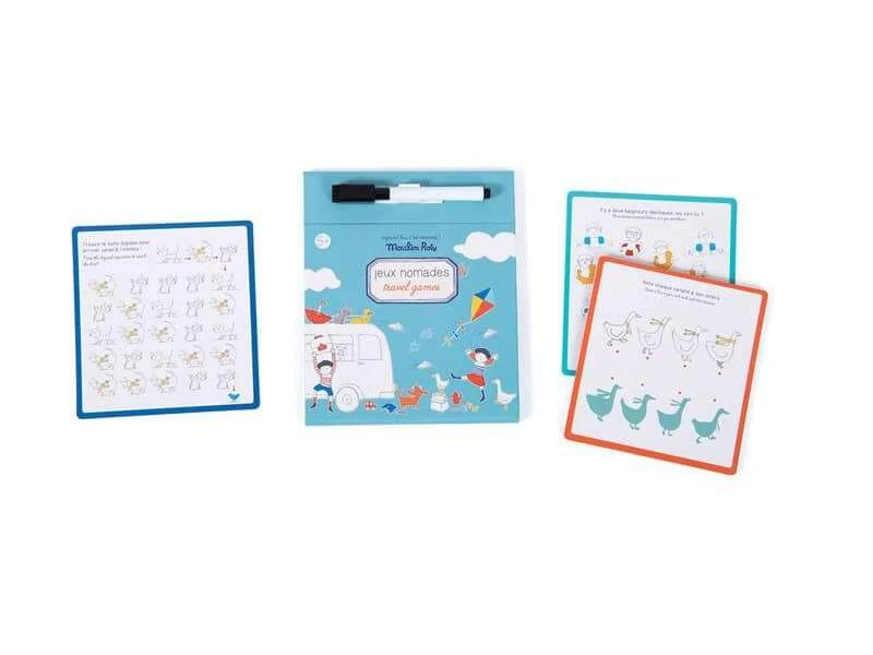 Jeux nomades Ă emporter partout avec soi ! La boĂ®te comporte une planche de jeu, un crayon effaçable et 15 cartes de jeux d’observation et de logique, avec les solutions. IdĂ©al pour occuper les enfants lors des longs trajets.