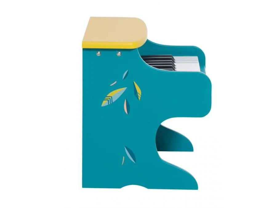 Piano électronique en bois, bleu pétrole avec de douces illustrations de plumes et montagnes… Il comprend 6 partitions de comptines à reproduire facilement grâce aux repères couleurs au-dessus des touches.