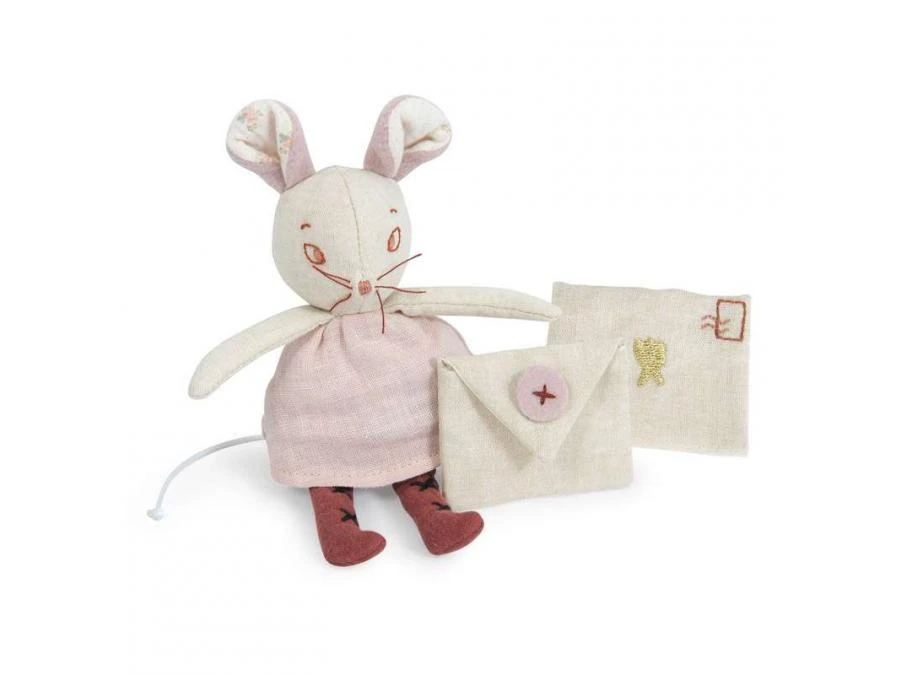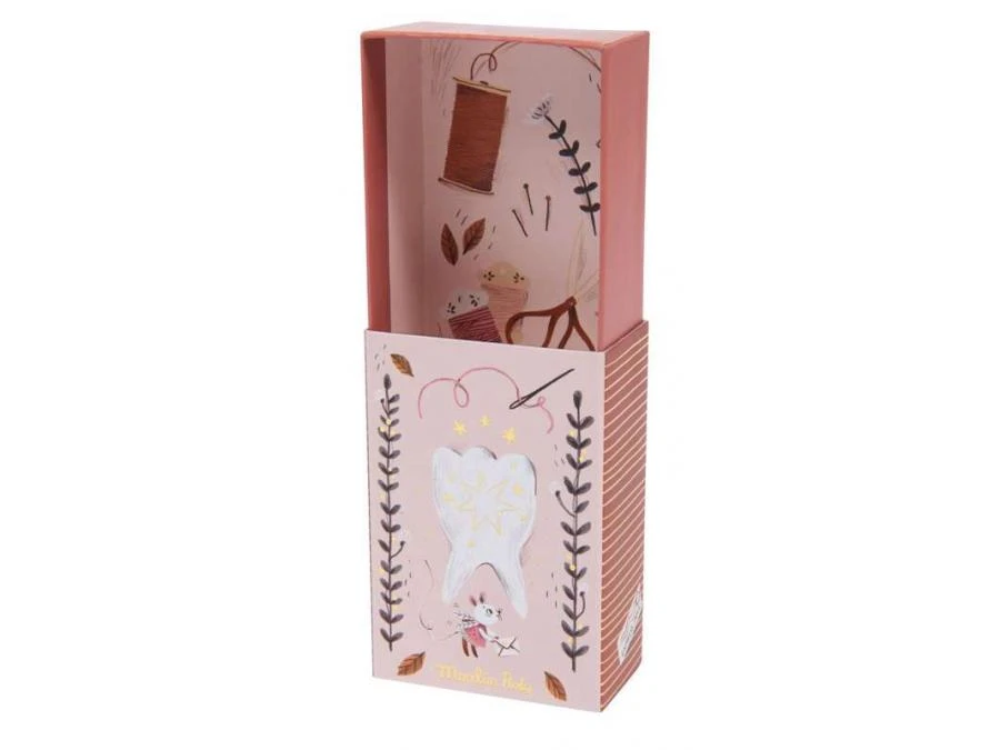 La petite souris fée tient dans sa main une enveloppe à scratch avec intérieur fleuri, pour ranger les dents de lait des enfants ! Elle est vêtue d’une robe en lin avec des ailes dans le dos, son minois est brodé et ses oreilles sont en velours tout doux.