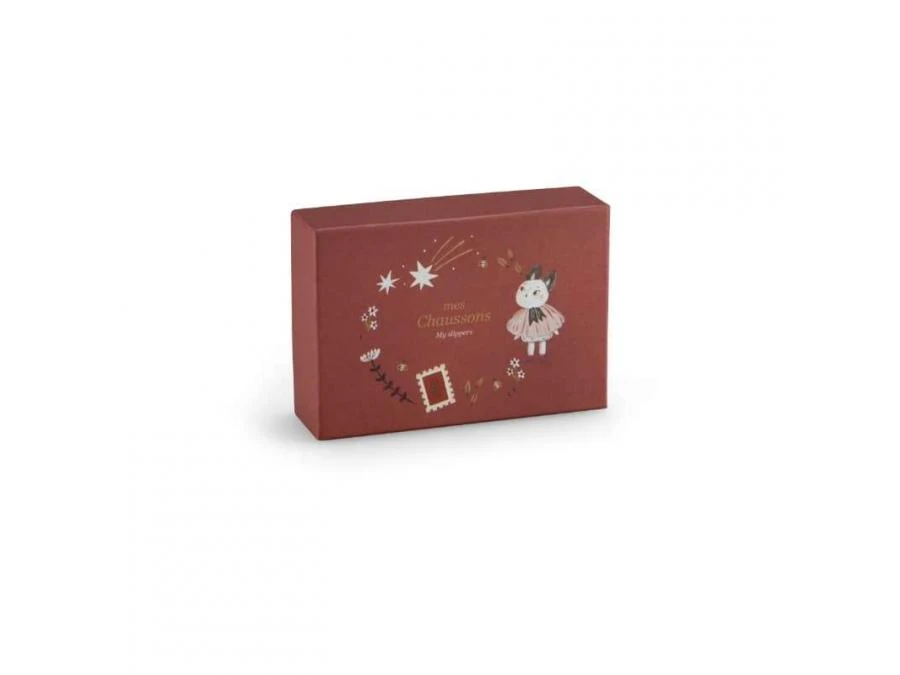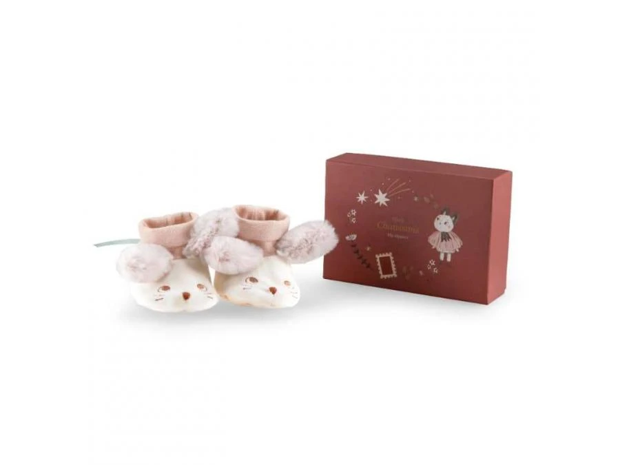 Une souris, deux souris… sur les petons de bébé ! Adorables chaussons blancs aux grandes oreilles parmes toutes douces, avec semelles en coton et jersey élastique pour bien tenir à la cheville. Ils se rangent dans une jolie boîte illustrée.