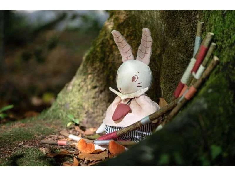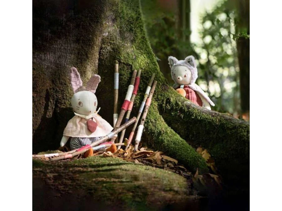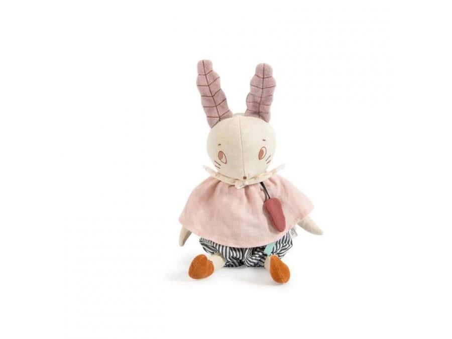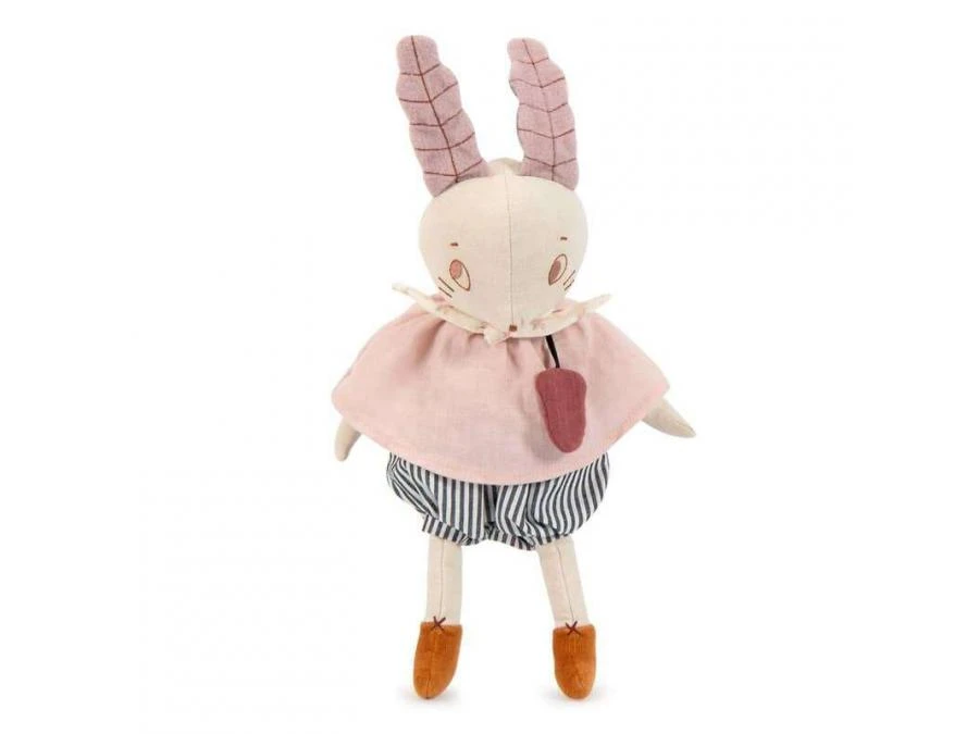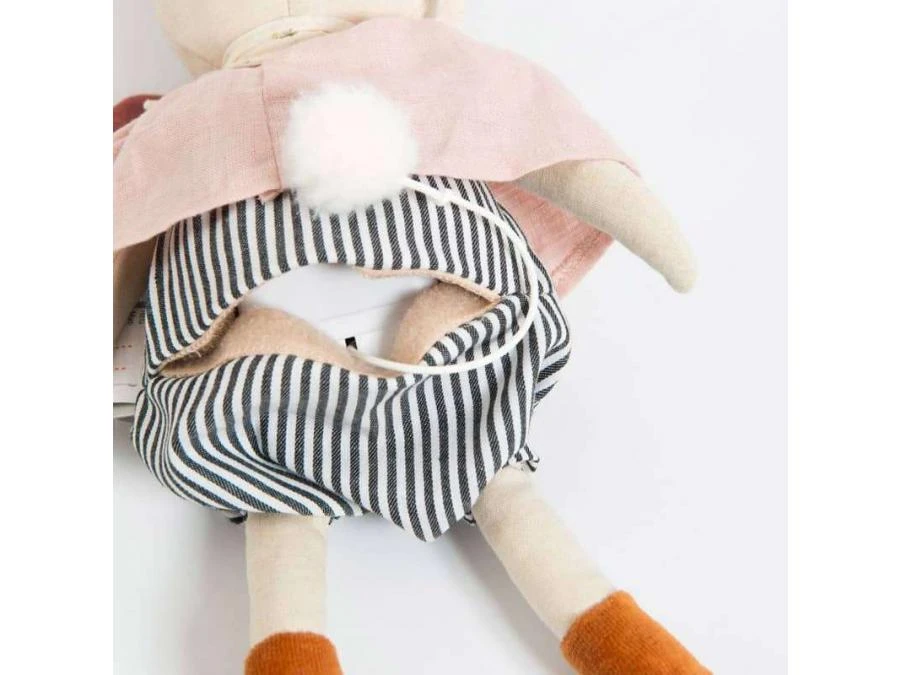 Poupée souris musicale fredonnant des airs japonais, en tissu chambray crème avec de grandes oreilles en polaire. Elle est vêtue d’un panty rayé et d’une blouse rose en lin. La boîte à musique s’enlève pour pouvoir la passer en machine.