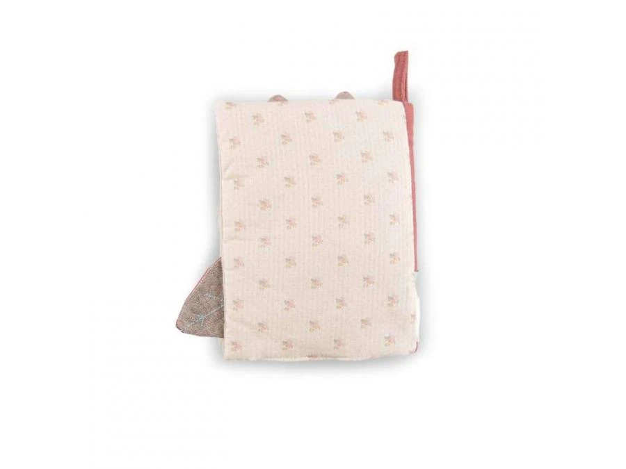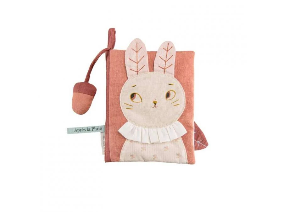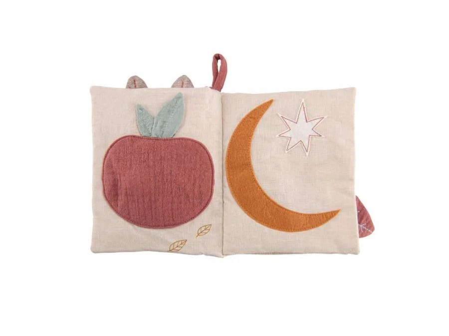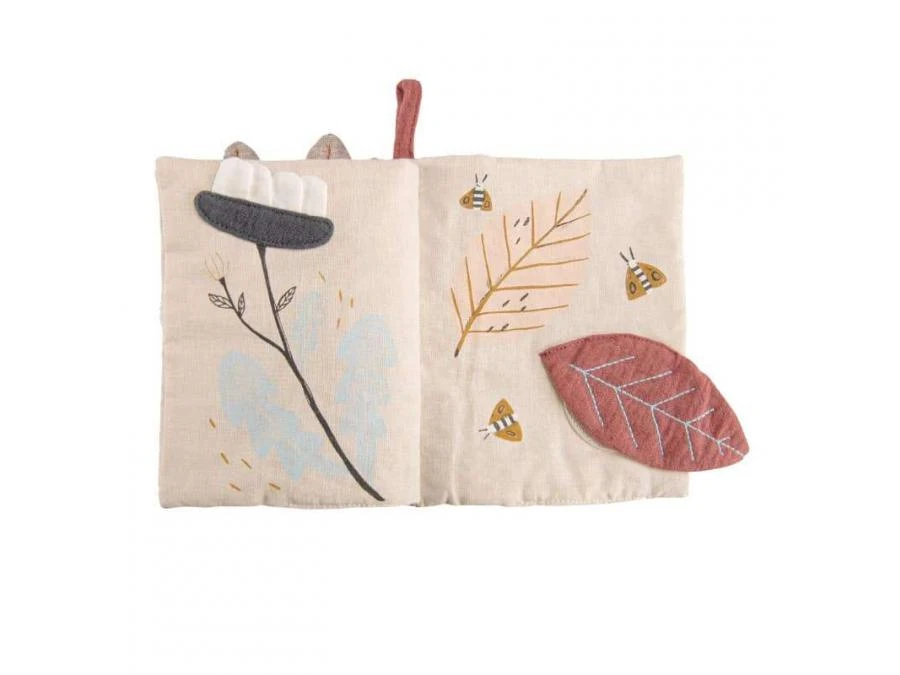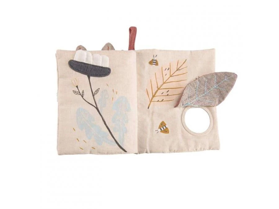 Jeu de textures et matières pour ce livre en tissu au portrait de Plume. On y découvre sur chaque page des éléments de la nature : nuage tout doux, gouttes de pluie qui font du bruit, caché sous une feuille il y a même un miroir pour y voir son reflet…