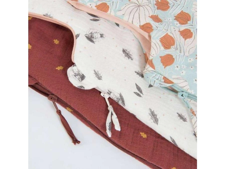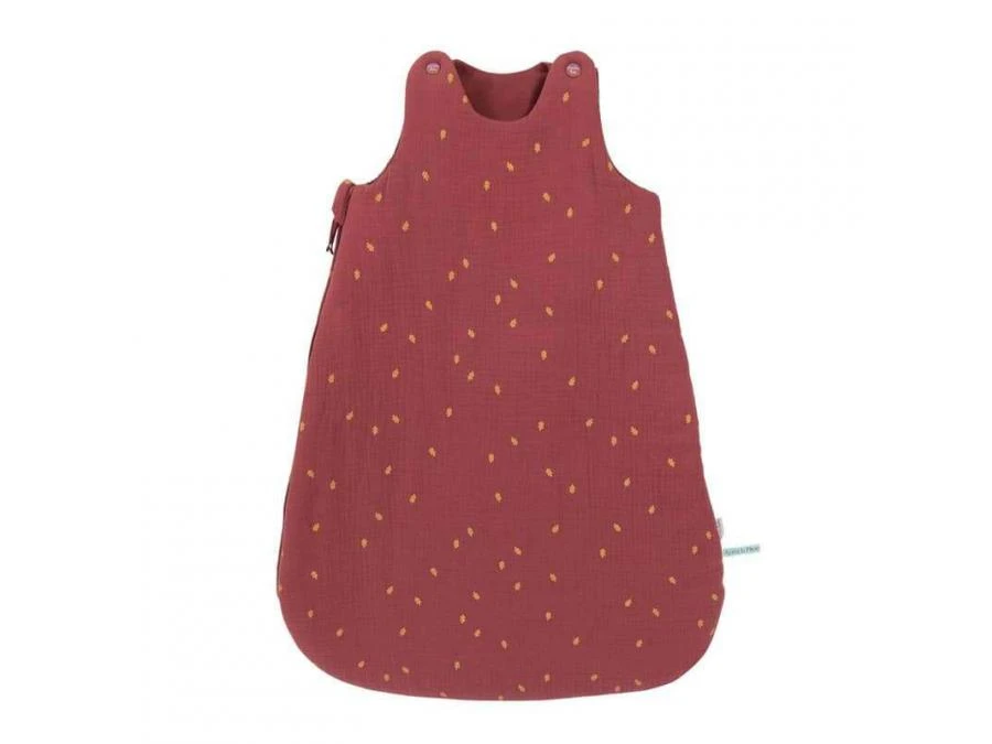 Gigoteuse 0-6 mois (TOG 3) en matières naturelles : lange terracotta avec motif feuilles de chêne sur l’extérieur, et doublure en toile 100% coton pour laisser respirer la peau de bébé. Fermeture à glissière et boutons-pression pour un habillage facile.