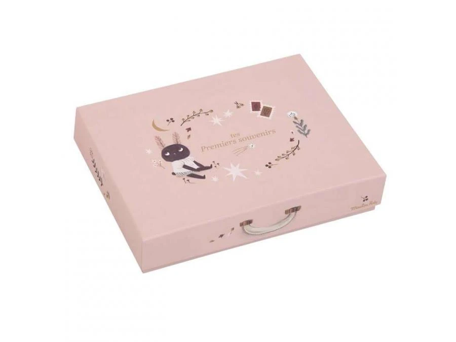Tous tes premiers souvenirs, rassemblés dans un coffret illustré. Petits carnets de notes, images à distribuer, stickers, sachets en tissu ou boîte à trésors, et même un poster avec ton arbre généalogique… Tout se rejoint, et se conserve précieusement.