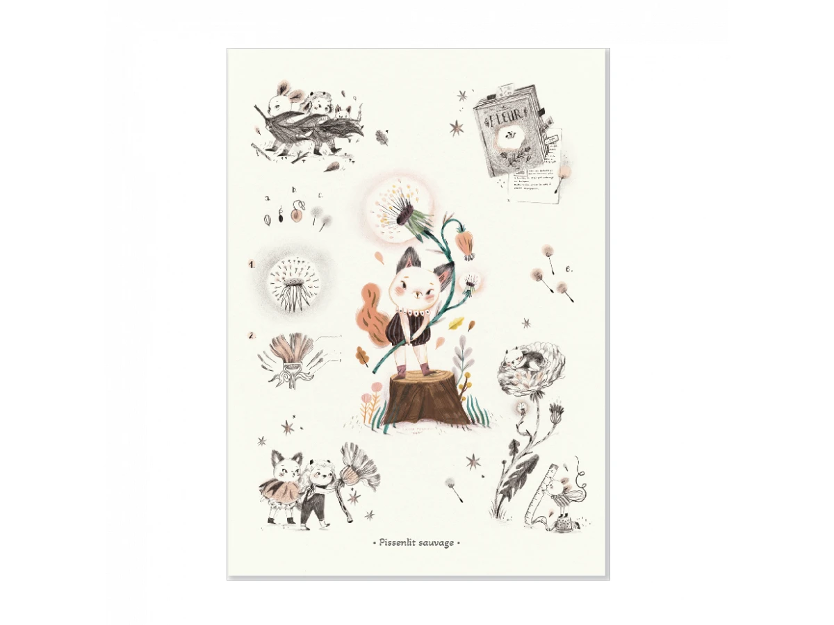 Affiche 50X70cm de la collection Après la pluie. Les doux personnages observent en détail le pissenlit sauvage au jardin, leur terrain de jeu favori. Illustrée par Lucille Michieli. Imprimé en France à base d’encres végétales sur du papier certifié FSC.